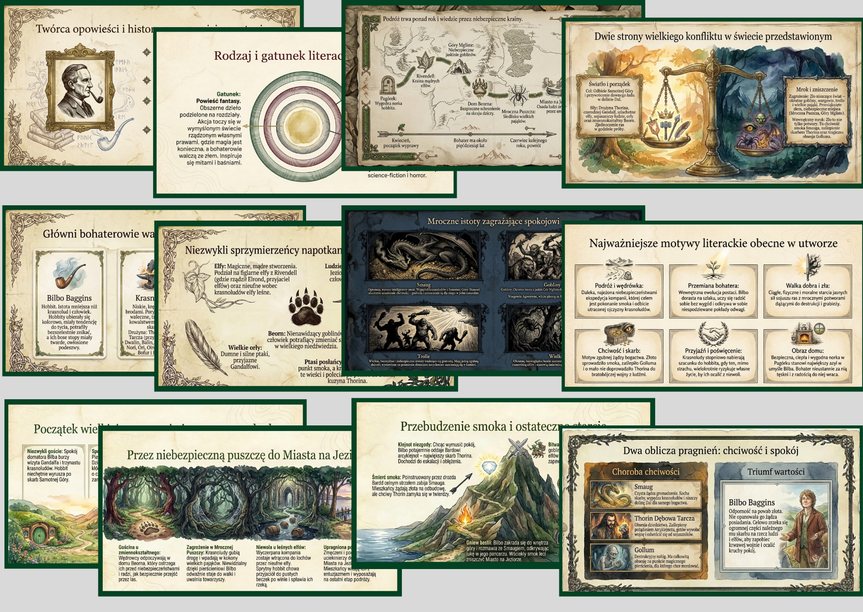 Gotowa do użycia prezentacja multimedialna oparta na lekturze Hobbit, czyli tam i z powrotem, idealna dla uczniów szkoły podstawowej (klasa 6). Materiał doskonale sprawdzi się podczas lekcji języka polskiego, powtórzenia wiadomości lub jako pomoc dydaktyczna do omówienia lektury.