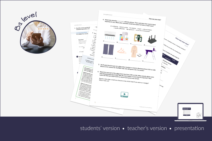 How was your stay? to gotowa lekcja, w której temat recenzji hoteli stanowi punkt wyjścia do szerszej pracy z językiem przydatnym w podróży. Uczniowie poznają i ćwiczą słownictwo potrzebne nie tylko do opisywania noclegu, lecz także do jego wyboru np. nazwy udogodnień czy opisywanie jakości obsługi. W lekcji znalazło się także miejsce na krótkie zagadnienie gramatyczne (gradable i non-gradable adjectives) oraz zadanie oparte na autentycznym materiale wideo, które wprowadza temat w naturalnym kontekście i zachęca do dyskusji.