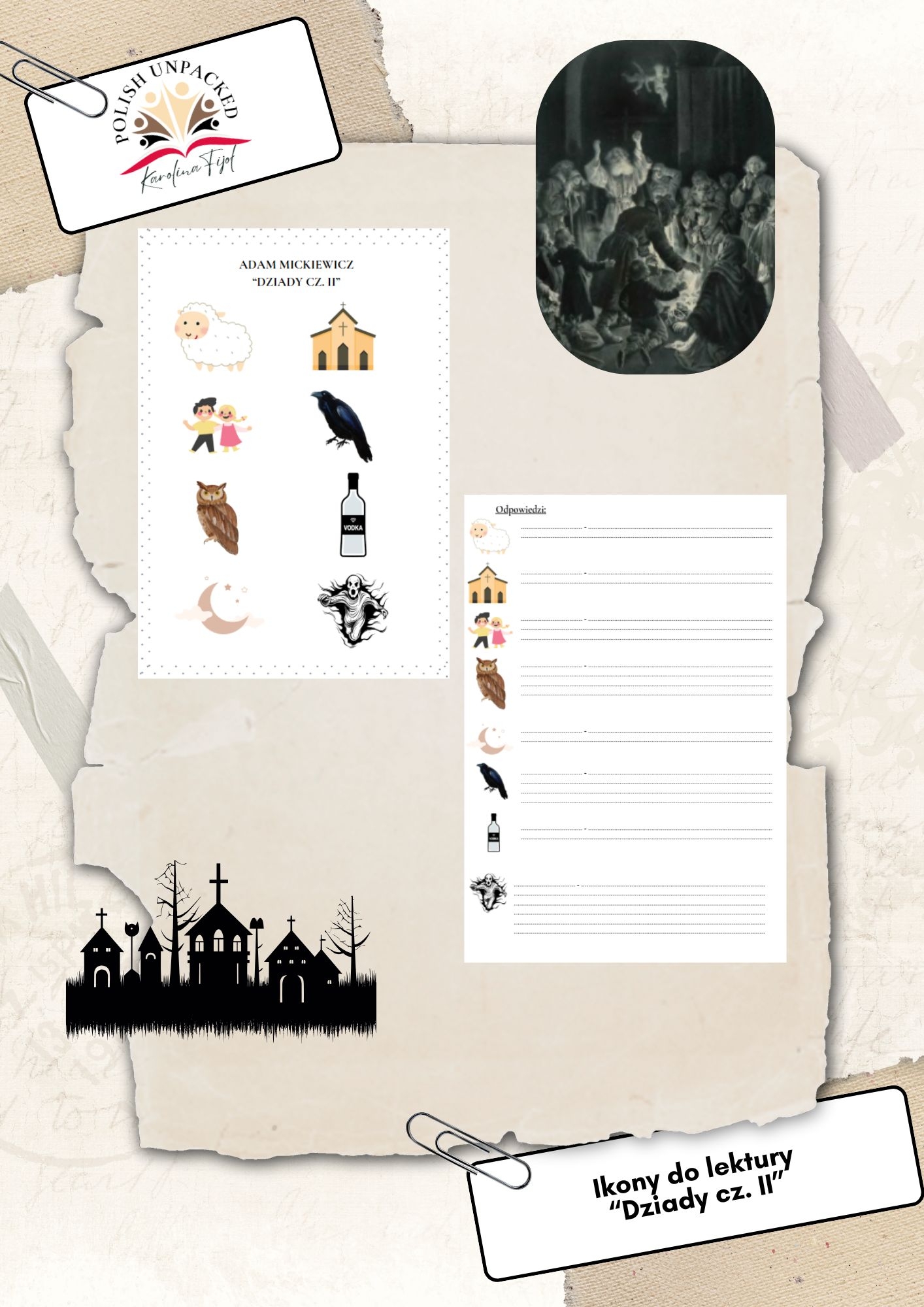 Praktyczny zestaw kart pracy dla ósmoklasistów, stworzony z myślą o skutecznym powtórzeniu najważniejszych treści i symboli z lektury „Dziady cz. II”.