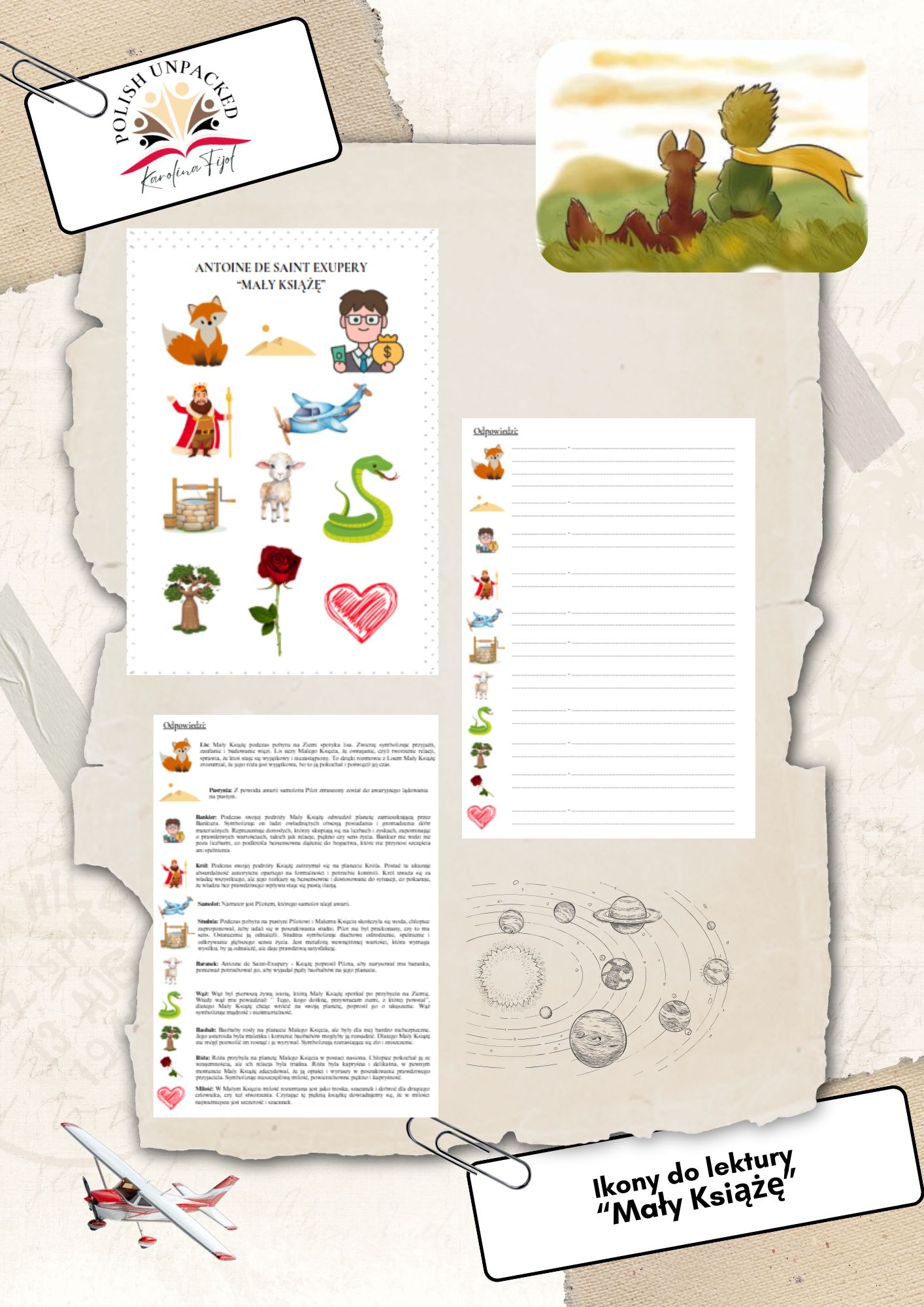 Praktyczny zestaw kart pracy dla ósmoklasistów, stworzony z myślą o skutecznym powtórzeniu najważniejszych treści i symboli z lektury „Mały Książę”.