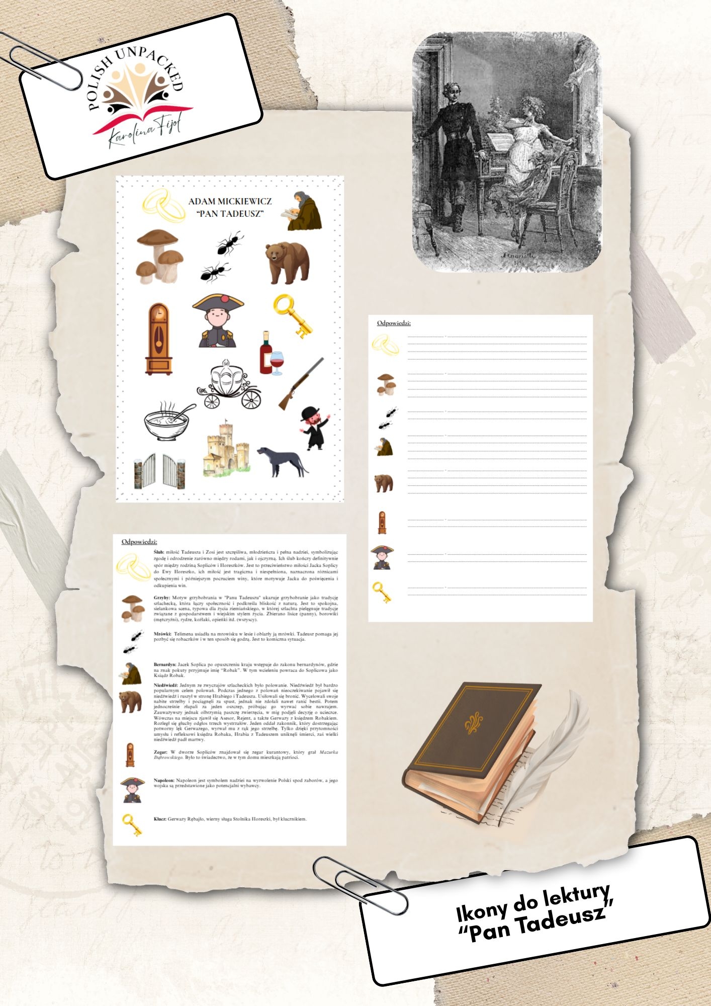Praktyczny zestaw kart pracy dla ósmoklasistów, stworzony z myślą o skutecznym powtórzeniu najważniejszych treści i symboli z lektury „Pan Tadeusz”.