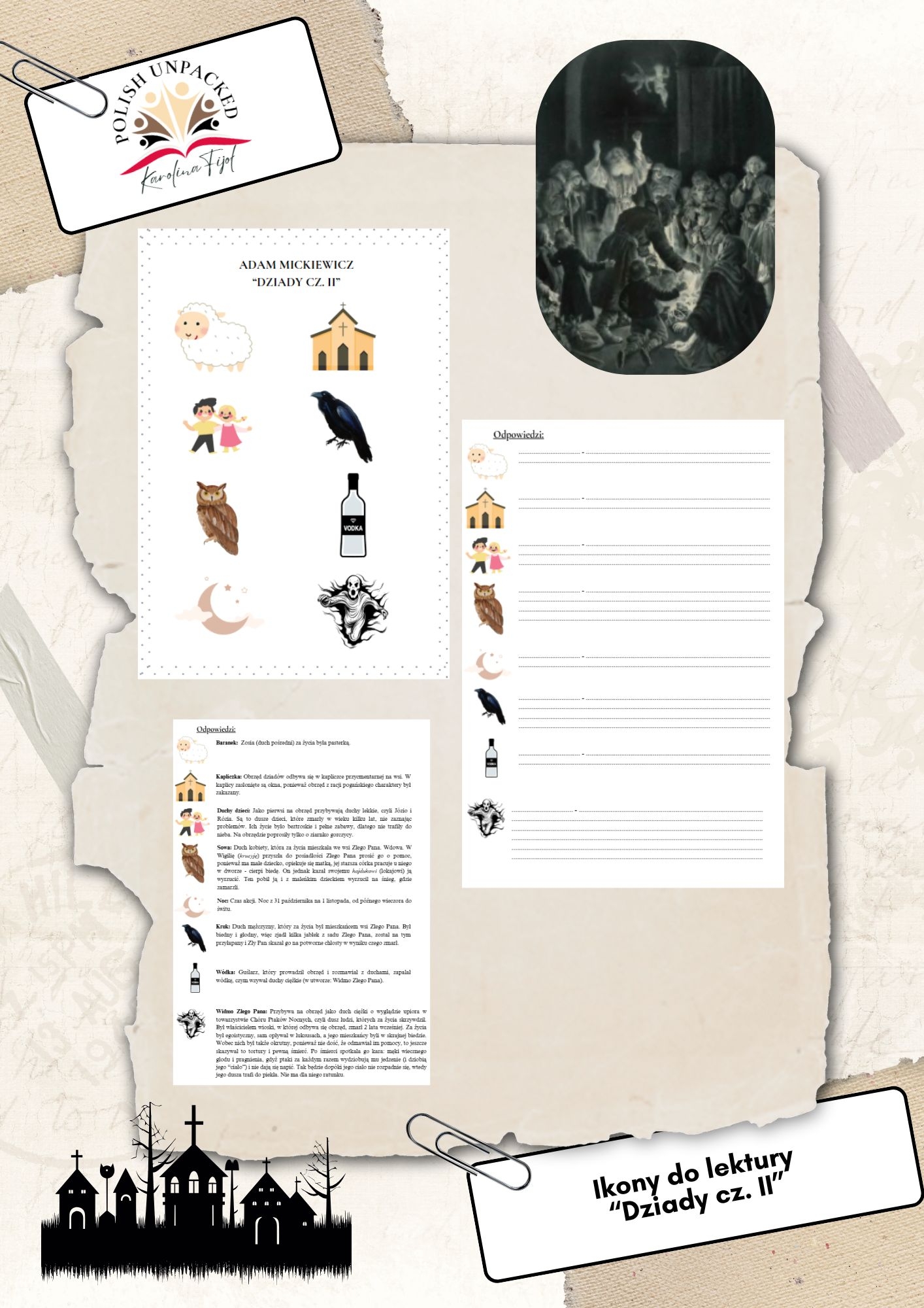 Praktyczny zestaw kart pracy dla ósmoklasistów, stworzony z myślą o skutecznym powtórzeniu najważniejszych treści i symboli z lektury „Dziady cz. II”.