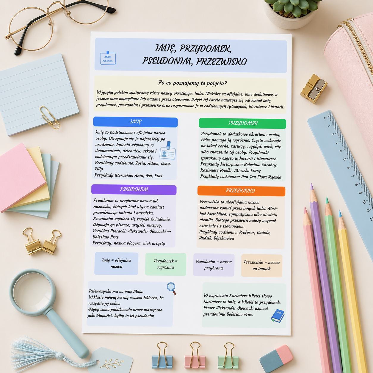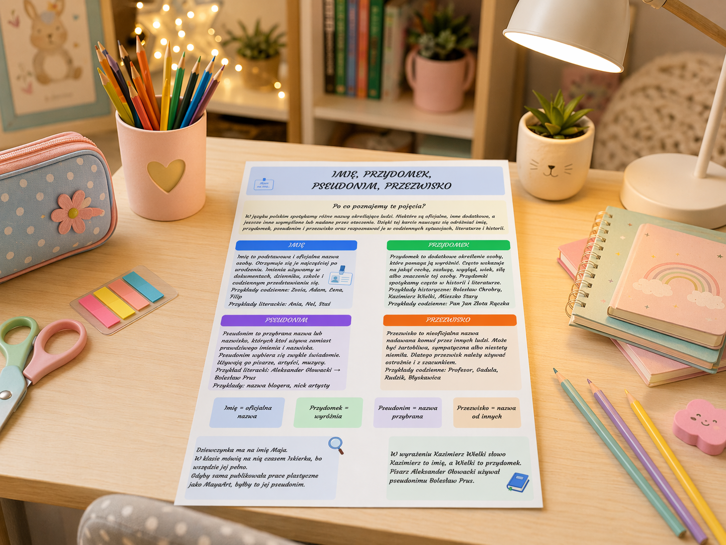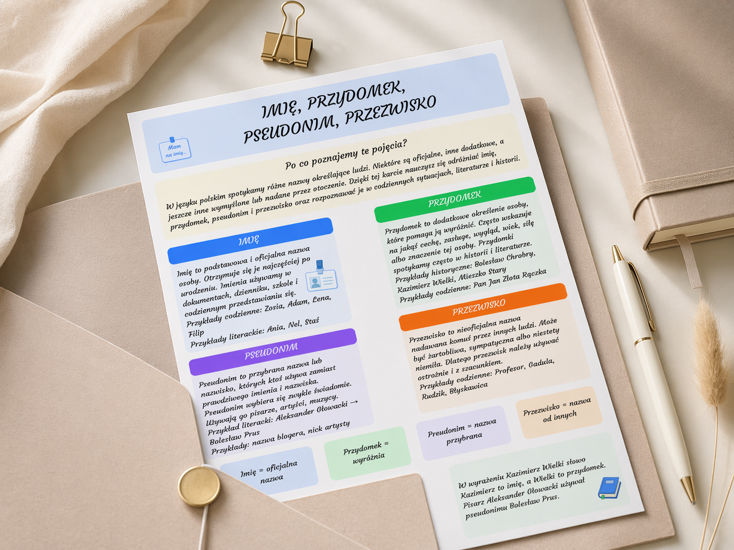 W pierwszej części jasno wyjaśniam każde pojęcie, pokazując jego znaczenie i zastosowanie. Dbam o to, by definicje były proste, konkretne i poparte przykładami – od znanych postaci historycznych po sytuacje szkolne. Wprowadzam też krótkie podsumowania („Imię = oficjalna nazwa”, „Pseudonim = nazwa przybrana”), które pomagają uczniom szybko utrwalić wiedzę 💡📖. Całość uzupełniłam krótkimi scenkami i przykładami, które angażują i pobudzają wyobraźnię.