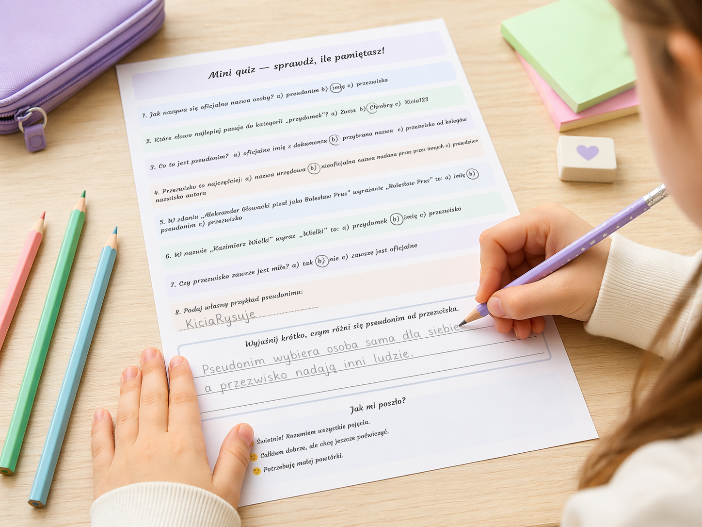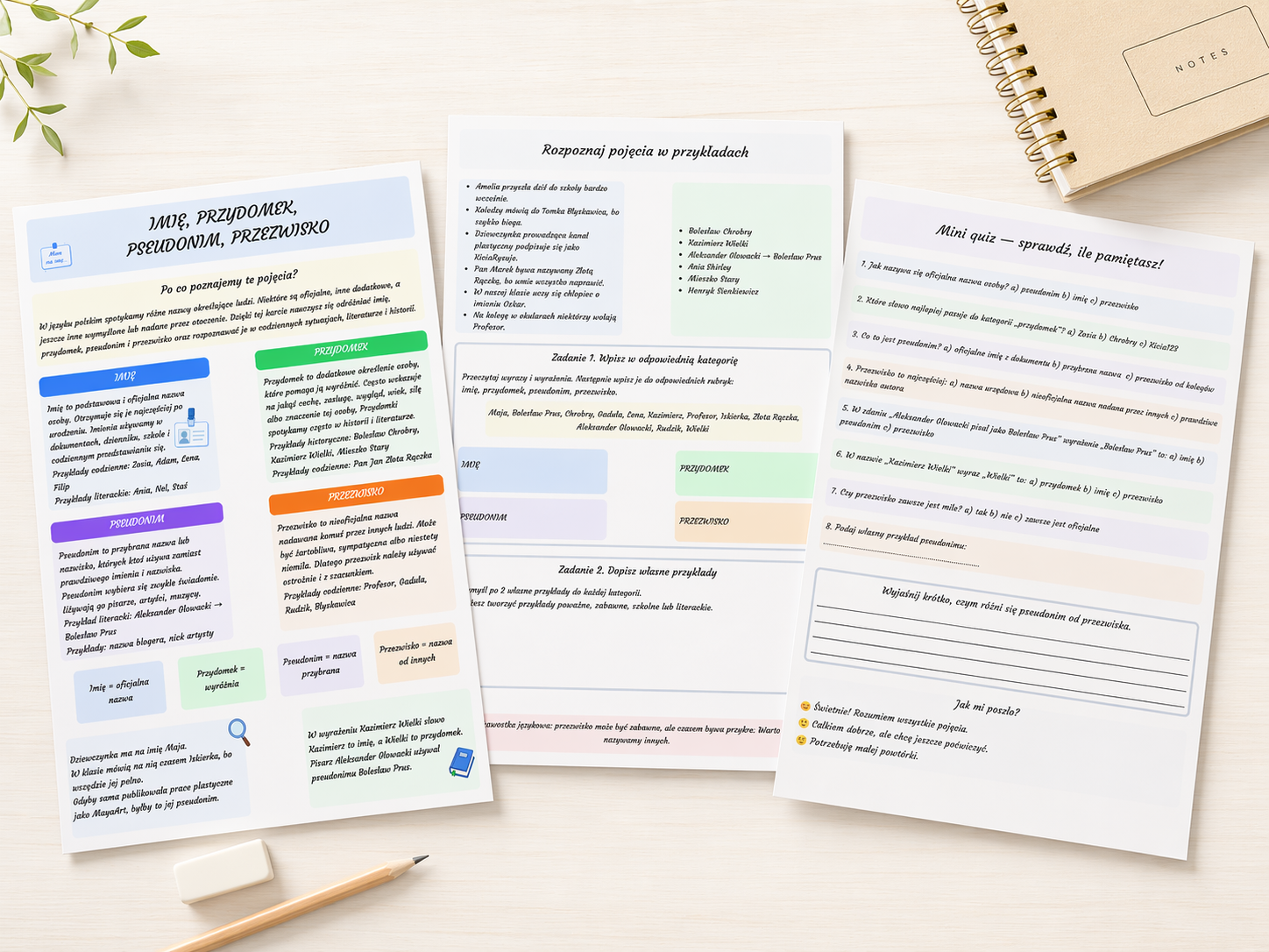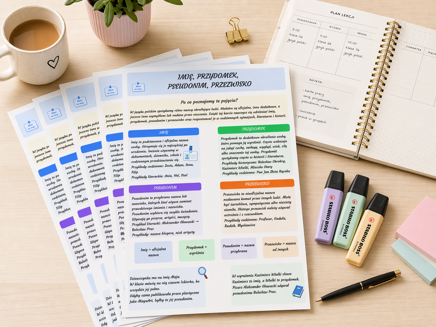 W pierwszej części jasno wyjaśniam każde pojęcie, pokazując jego znaczenie i zastosowanie. Dbam o to, by definicje były proste, konkretne i poparte przykładami – od znanych postaci historycznych po sytuacje szkolne. Wprowadzam też krótkie podsumowania („Imię = oficjalna nazwa”, „Pseudonim = nazwa przybrana”), które pomagają uczniom szybko utrwalić wiedzę 💡📖. Całość uzupełniłam krótkimi scenkami i przykładami, które angażują i pobudzają wyobraźnię.
