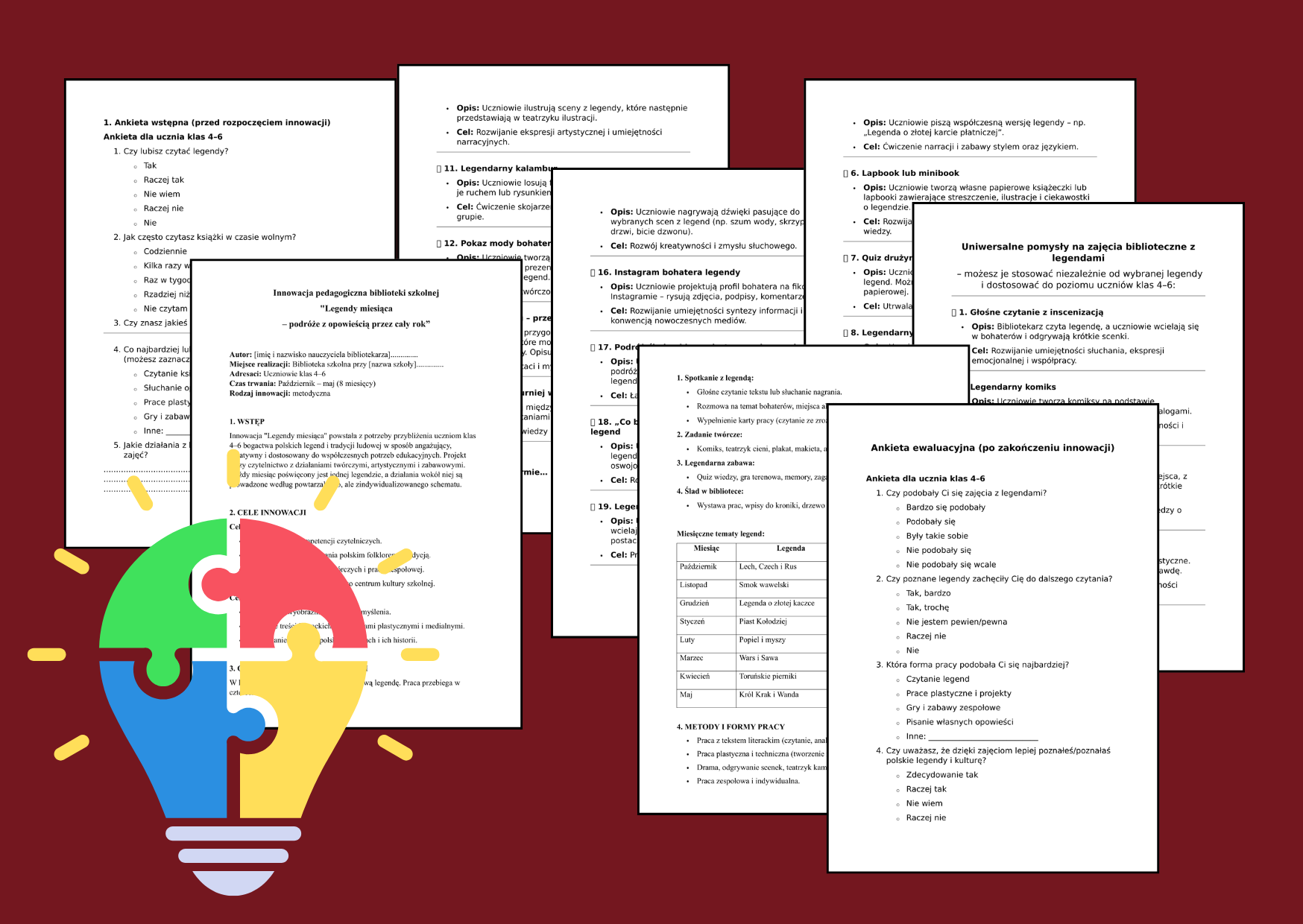 „Legendy miesiąca” to gotowa do wdrożenia innowacja biblioteczna dla klas 4–6, która łączy czytanie, zabawę i edukację regionalną. Każdy miesiąc poświęcony jest jednej polskiej legendzie i miejscu, z którym jest związana. Uczniowie nie tylko czytają teksty, ale też tworzą komiksy, gry, kapsuły czasu, alternatywne zakończenia czy projekty multimedialne. Zajęcia pobudzają kreatywność, wspierają rozwój czytelnictwa i uczą szacunku do tradycji oraz kultury lokalnej.
