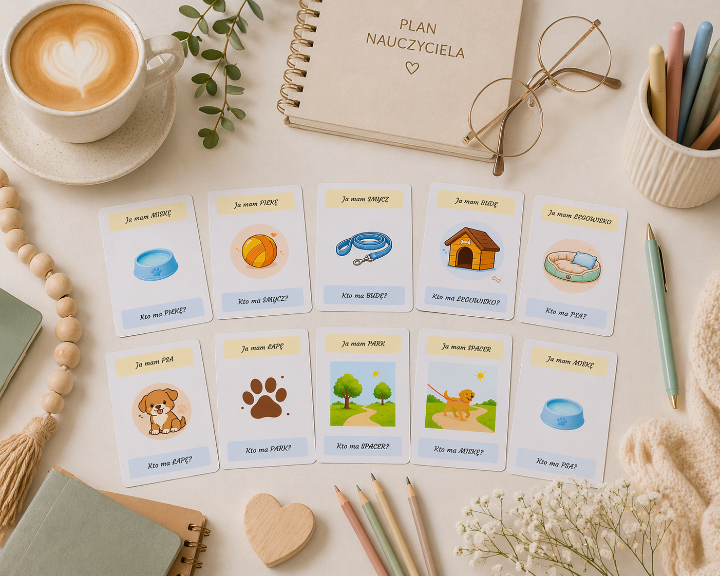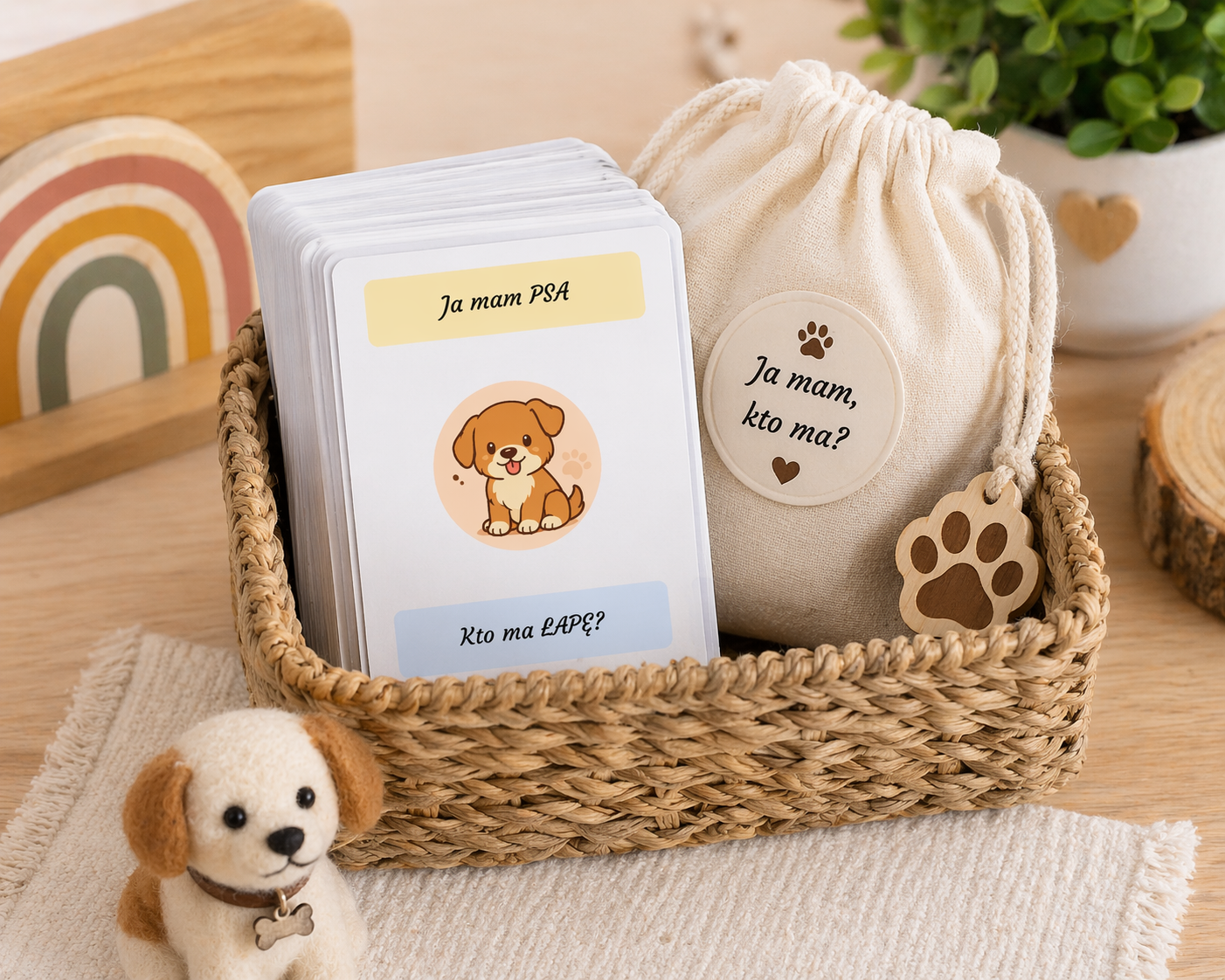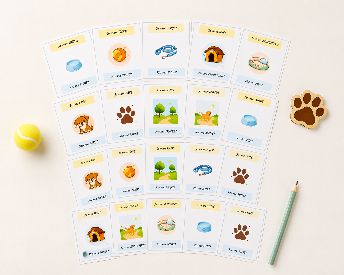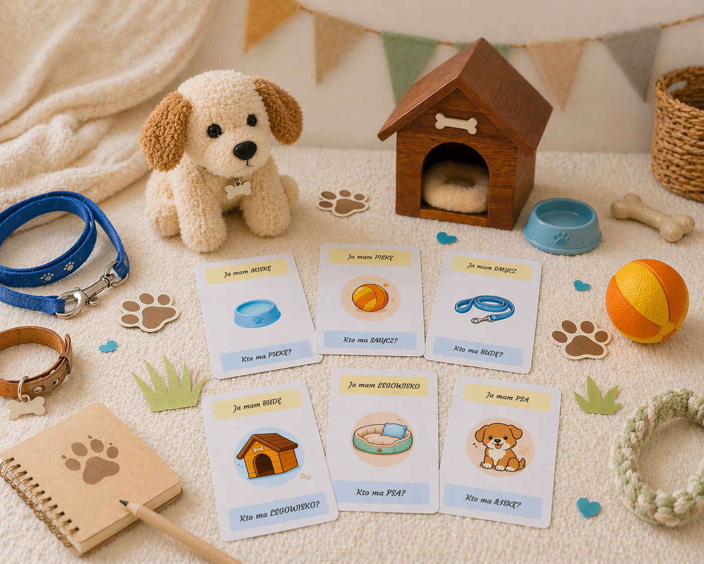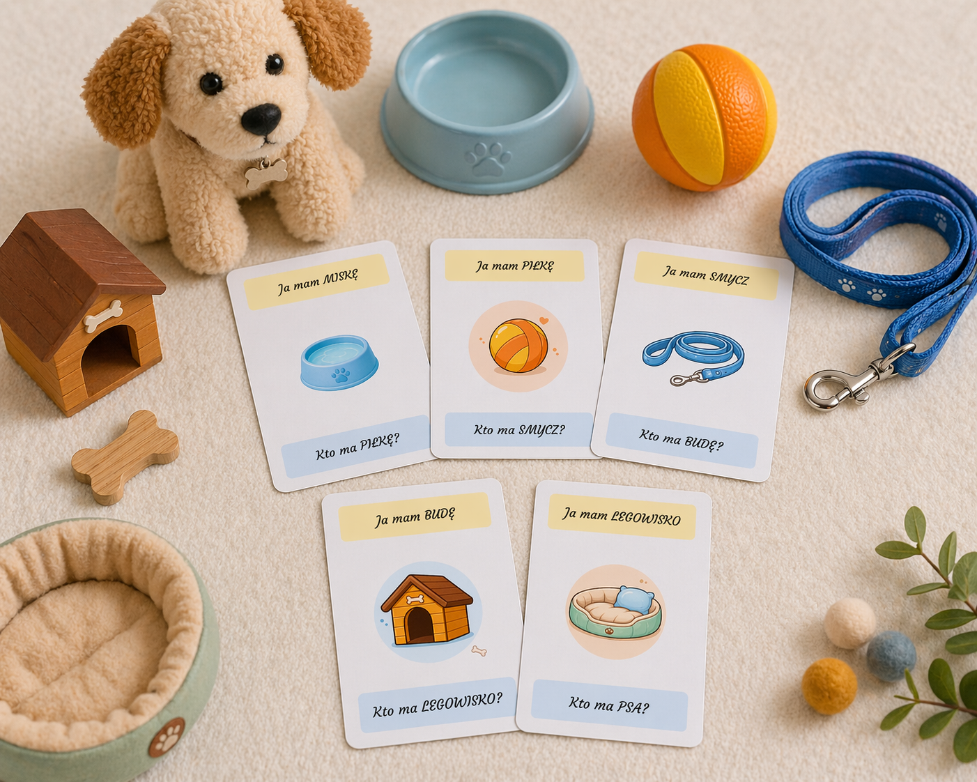 Zestaw kart „Ja mam… Kto ma…?” to atrakcyjna i angażująca gra językowa dla dzieci, oparta na tematyce psa i jego akcesoriów. Materiał rozwija mówienie, słuchanie oraz koncentrację, a przy okazji wprowadza i utrwala słownictwo związane z opieką nad zwierzętami.