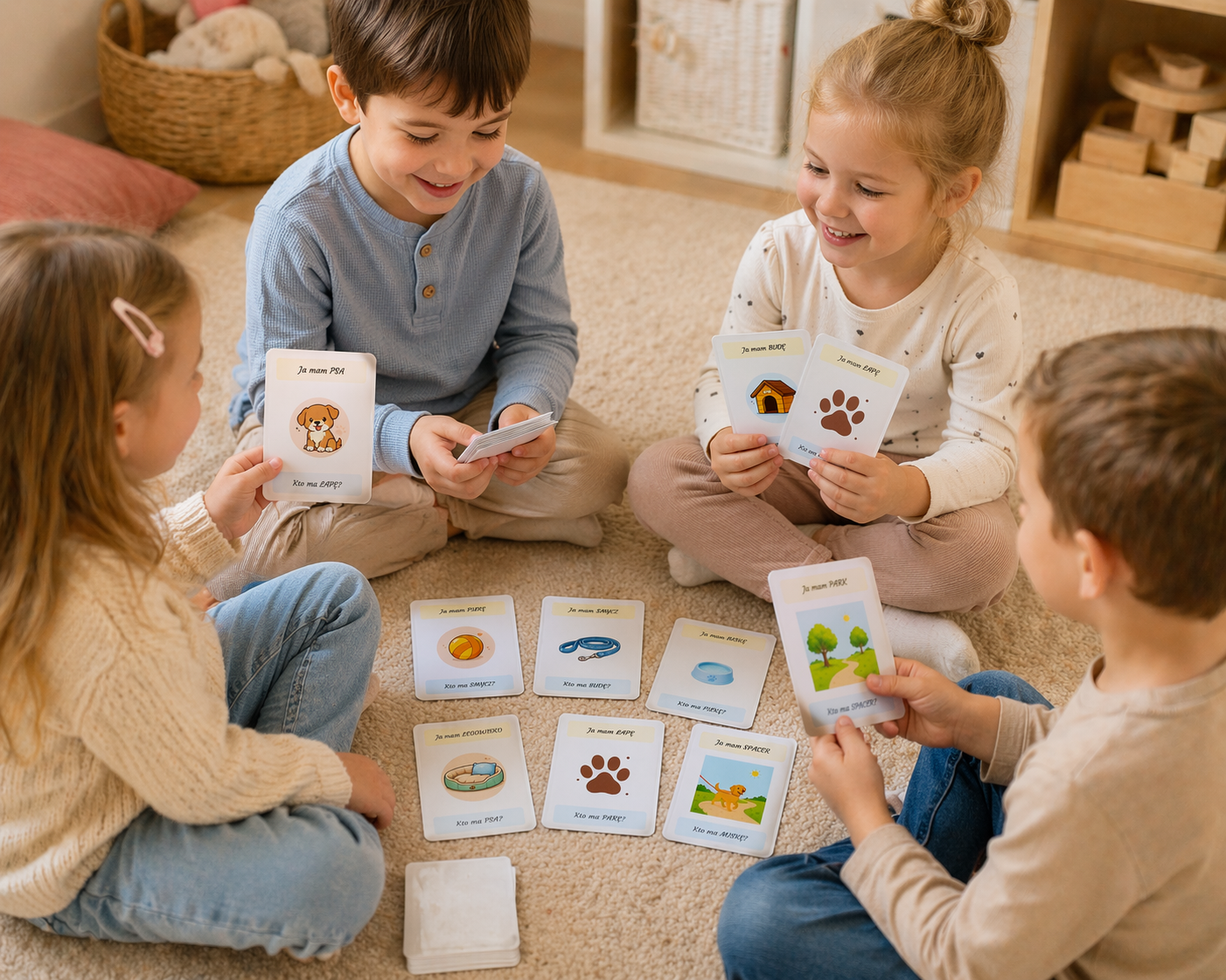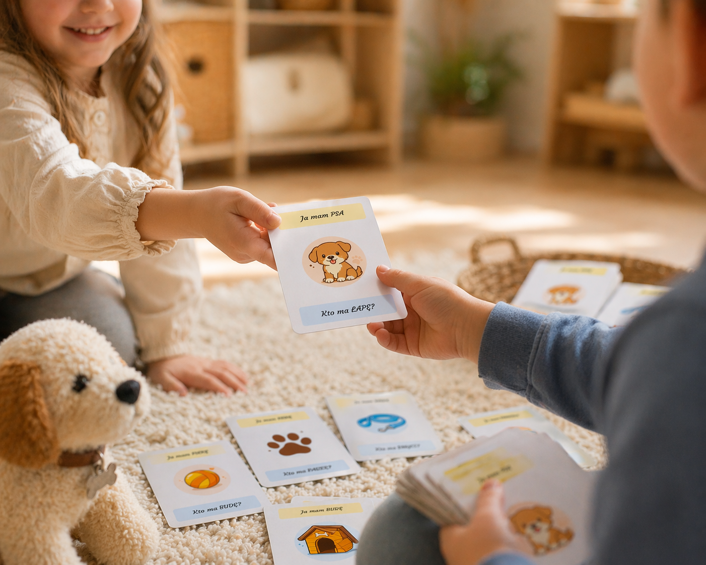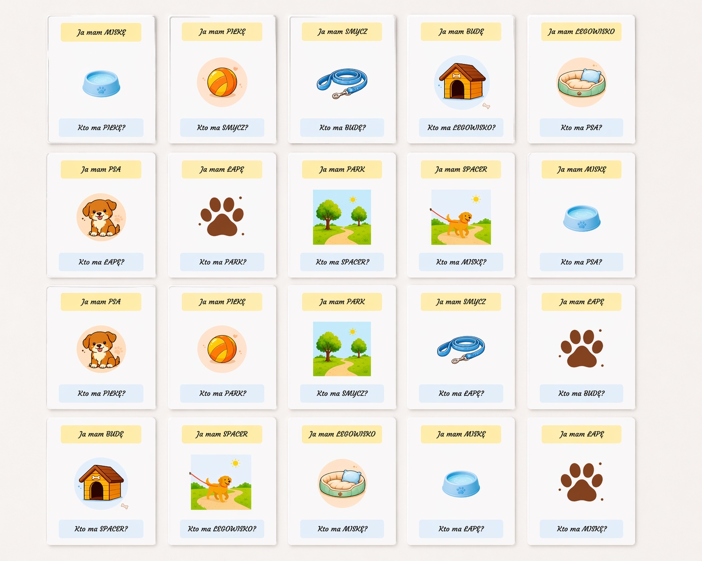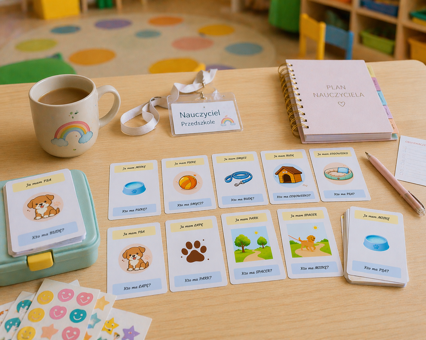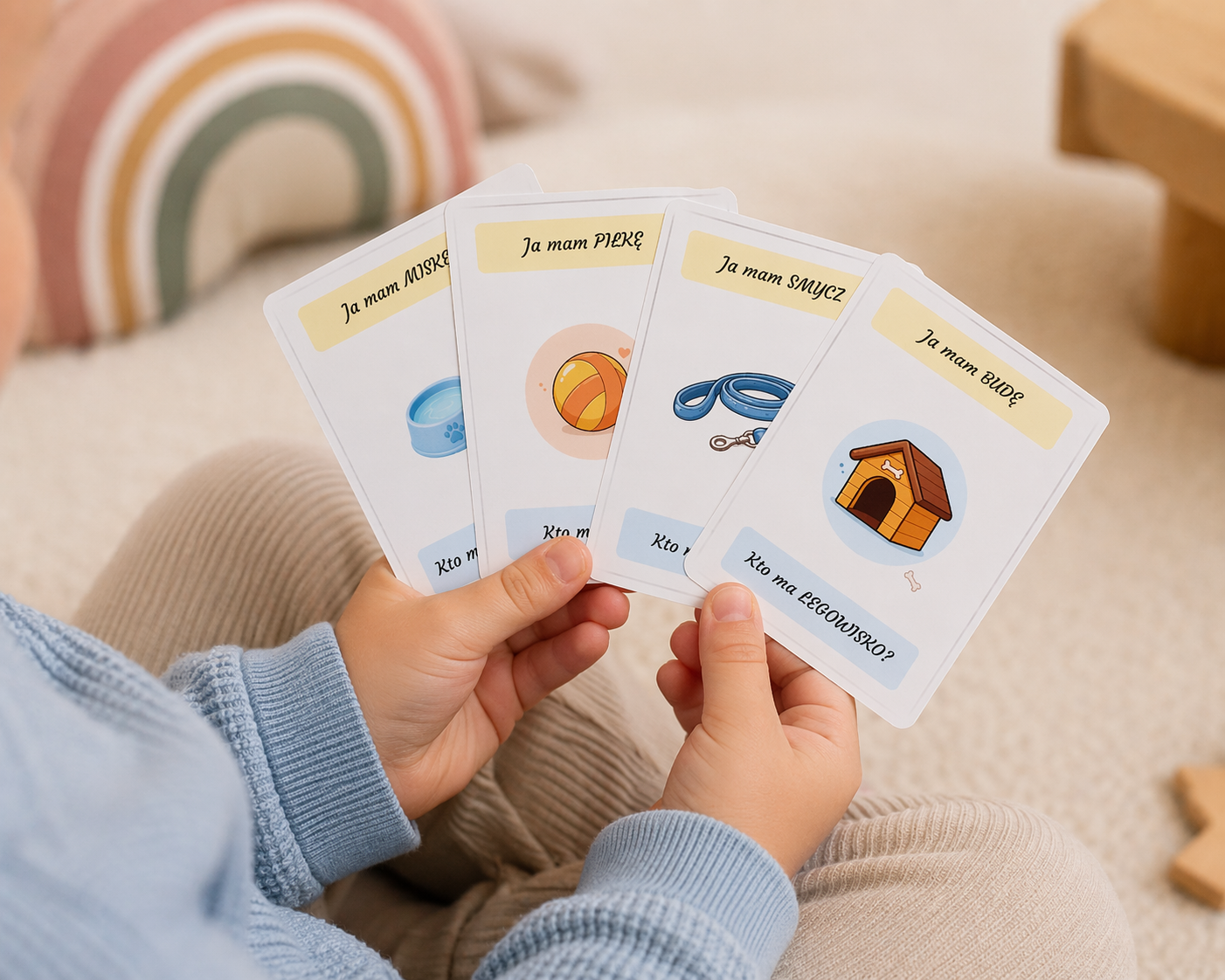 Zestaw kart „Ja mam… Kto ma…?” to atrakcyjna i angażująca gra językowa dla dzieci, oparta na tematyce psa i jego akcesoriów. Materiał rozwija mówienie, słuchanie oraz koncentrację, a przy okazji wprowadza i utrwala słownictwo związane z opieką nad zwierzętami.