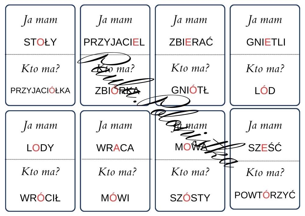 Materiał składa z 24 kart z wyrazami z ó wymiennym oraz wyrazami tłumaczącymi pisownie. W pliku znajdują się dwie wersje - jedna z wyróżnioną na czerwono wymianą głosek, druga bez wyróżnienia.