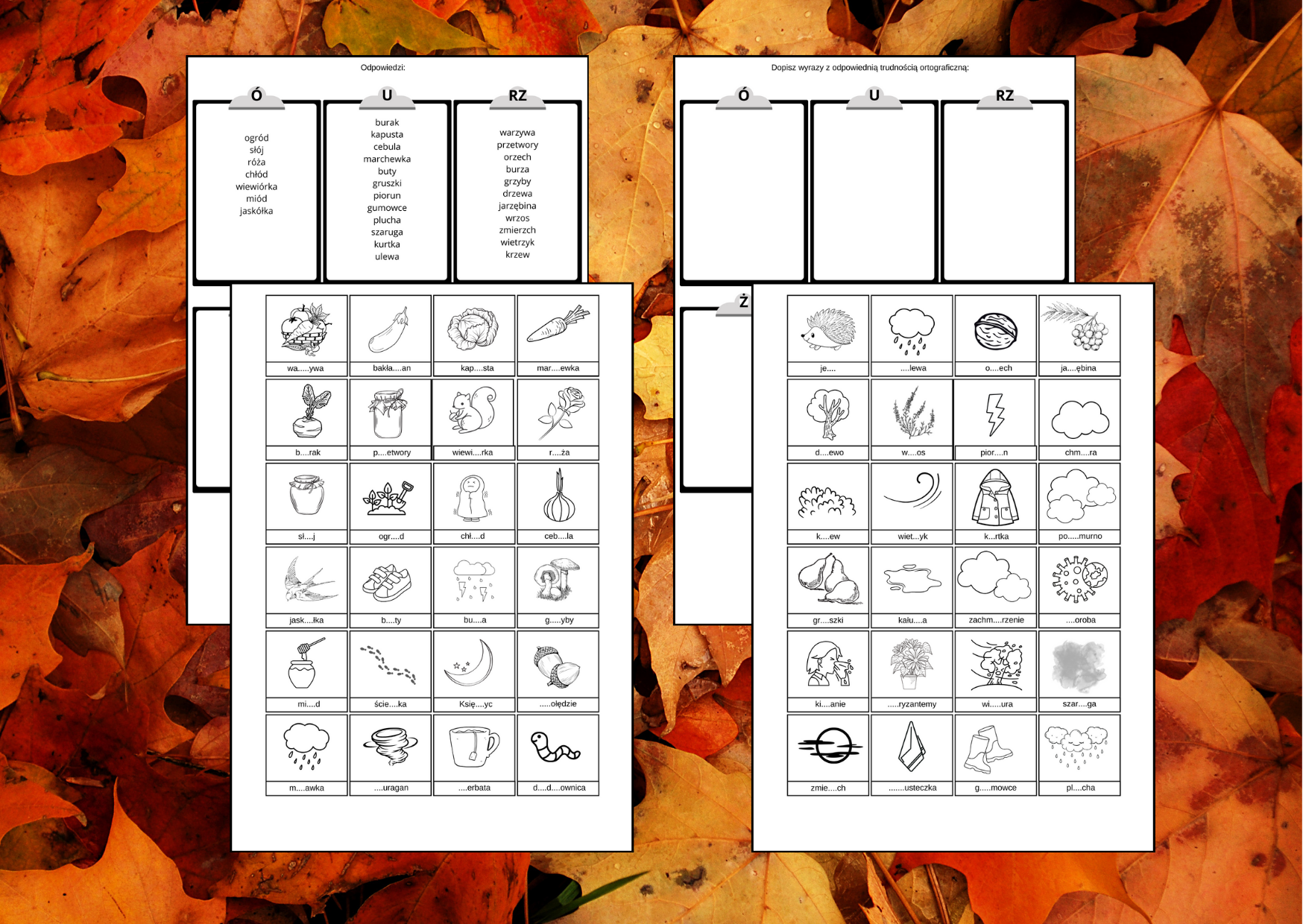 Zestaw 3 kart pracy: na dwóch znajdują się fiszki z grafikami i słowami z trudnością ortograficzną związanymi z jesienią (należy wpisać brakującą literkę). Na jednej karcie pracy puste „tabliczki”, które trzeba odpowiednio uzupełnić na podstawie kart z fiszkami.