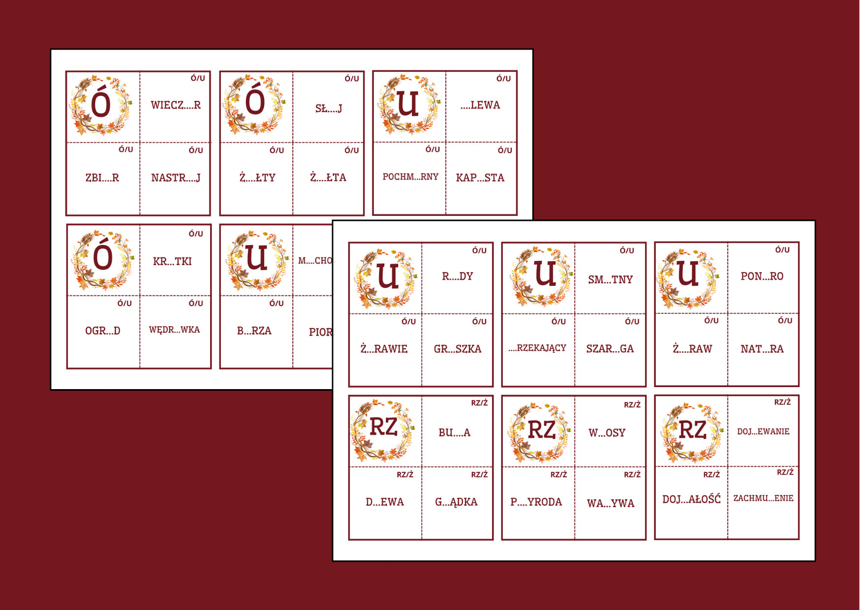 Zestaw zawiera 4 karty pdf do wydruku (format A4) z 57 wyrazami z trudnością ortograficzną, związanymi z jesienią (+ kilka pustych układanek). Po wydrukowaniu i wycięciu fiszek należy je przeciąć i wpisać brakującą literkę. Zadaniem uczniów jest dopasowanie karteczek. Po ułożeniu można wykorzystać wyrazy do ćwiczeń redakcyjnych.
