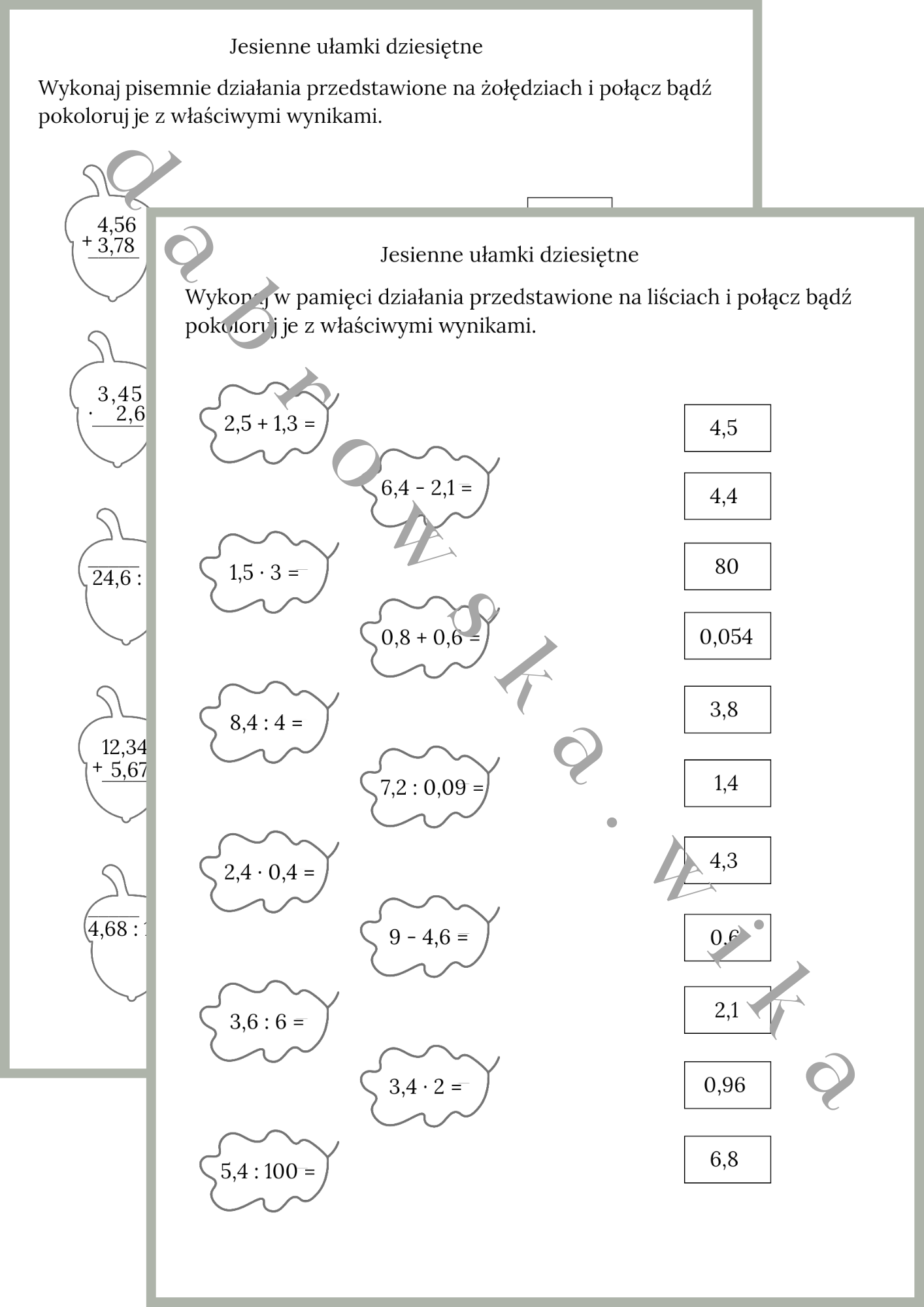 Pierwsza z nich polega na wykonaniu w pamięci działań na ułamkach dziesiętnych. Uczniowie mają za zadanie wykonać działania, a następnie połączyć lub pokolorować odpowiednie działania z wynikami.