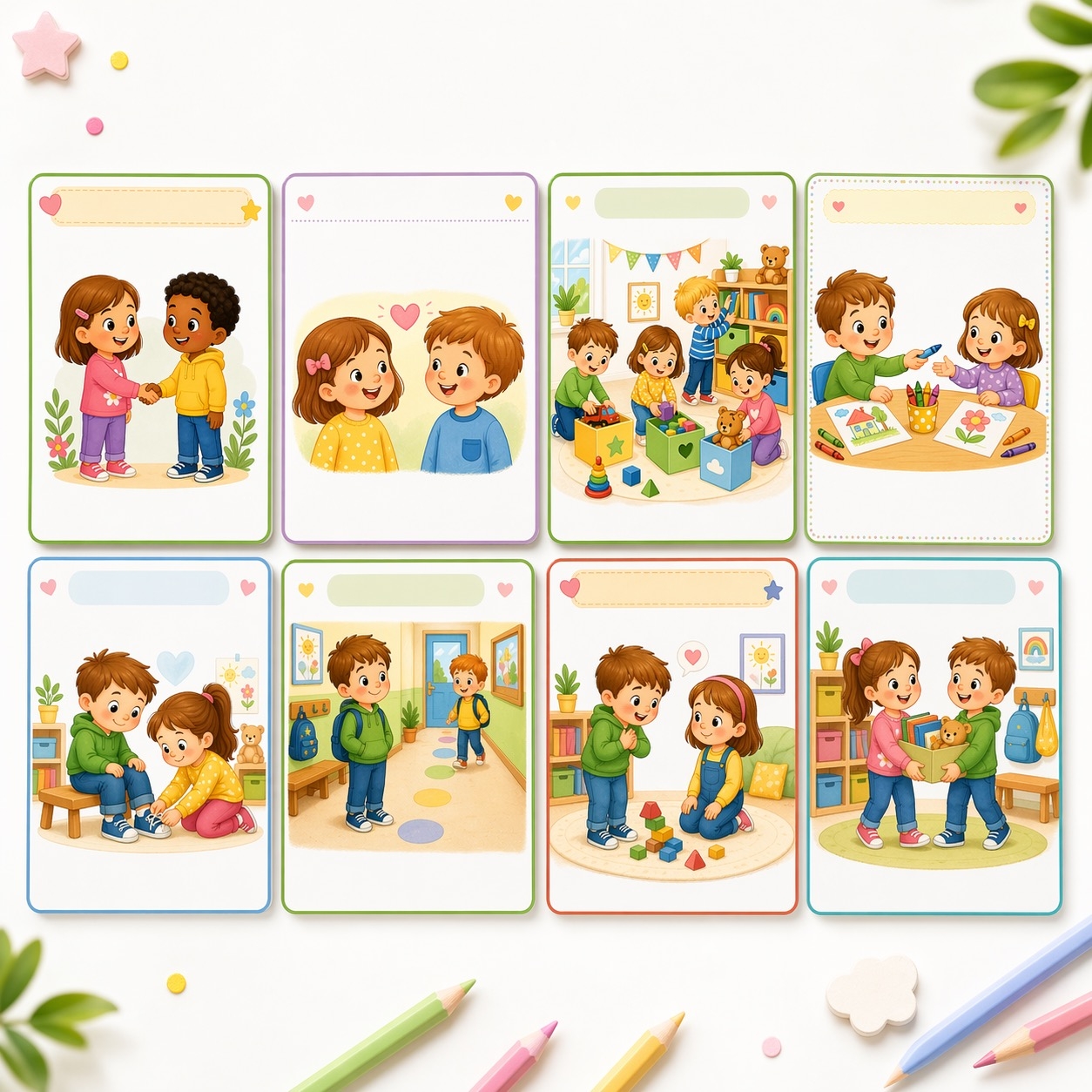 Ilustracje są przyjazne, kolorowe i dostosowane do wieku dzieci, dzięki czemu świetnie sprawdzą się jako dekoracja sali, materiał do rozmów kierowanych, zajęć o emocjach, relacjach i zasadach dobrego zachowania. Plansze mogą wspierać wychowanie do empatii, współpracy i budowania pozytywnych relacji w grupie. 💛