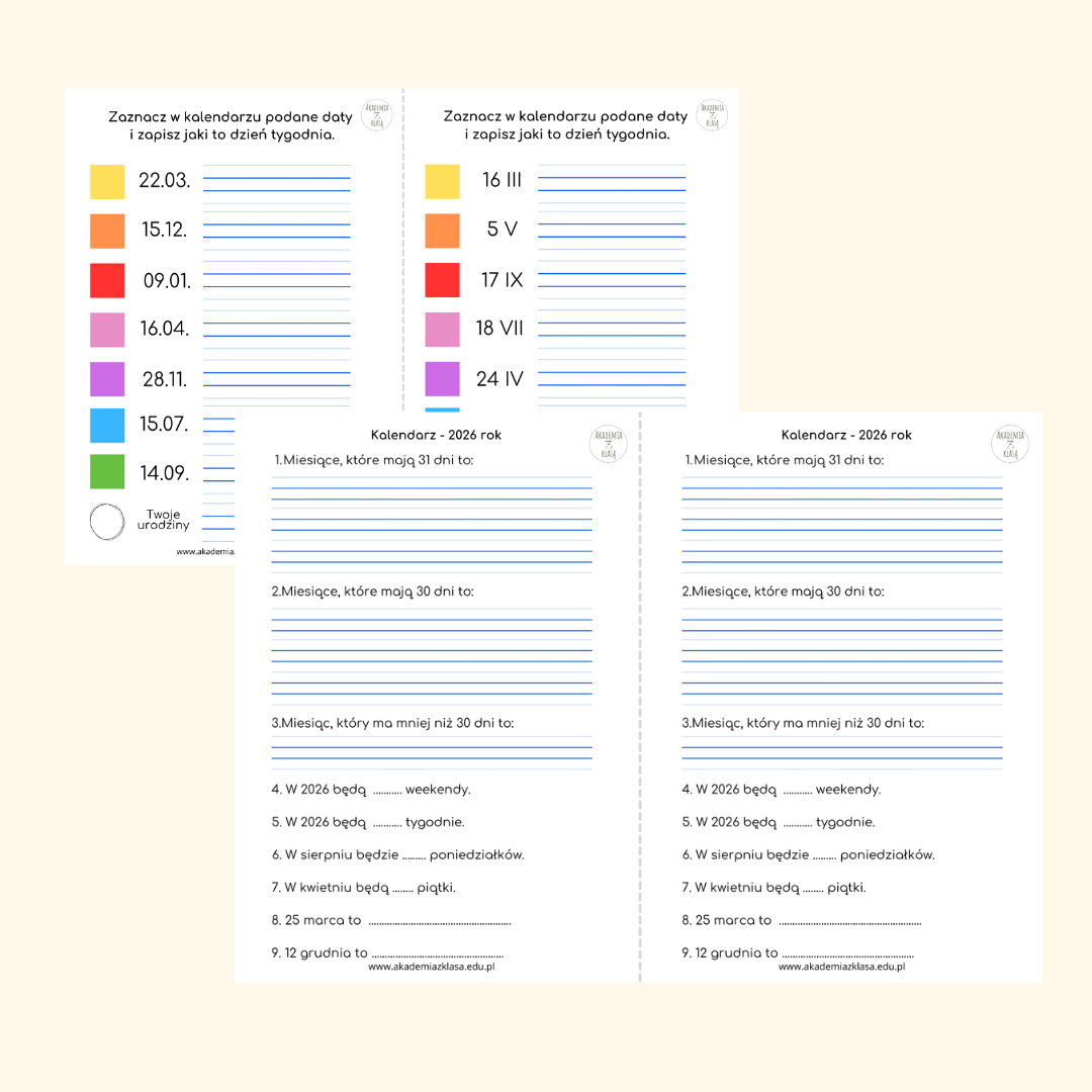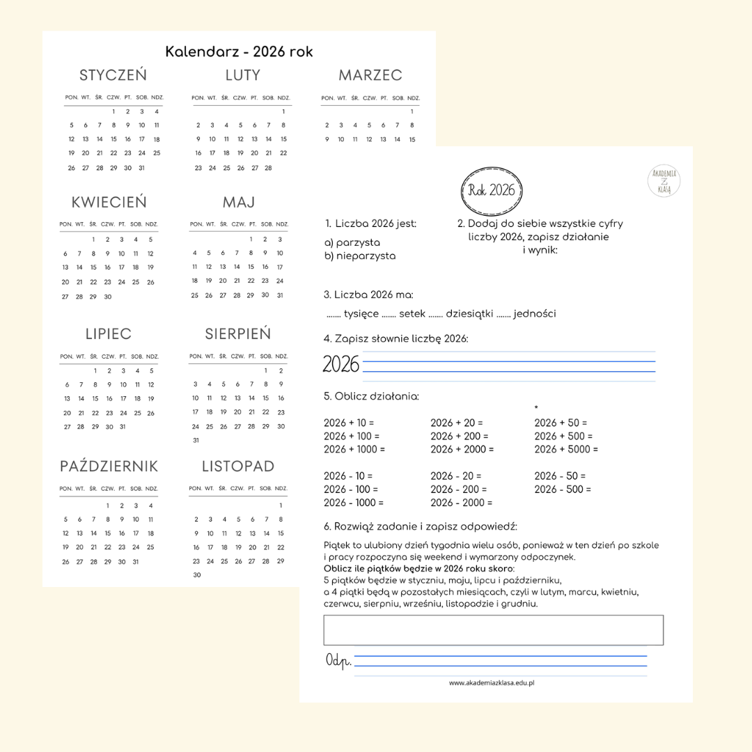 KLAENDARZ NA 2026 ROK - ZADANIA DLA KLAS 2 i 3 zawiera: - kalendarz na 2026 rok w formacie A4 do wykorzystania na zajęciach. - zadania z wykorzystaniem liczby 2026. - zadania do kalendarza na 2026 rok cz. 1 - wskazywanie miesięcy, które mają 30, 31 dni; liczby tygodni, weekendów. - zadania do kalendarza na 2026 rok cz. 2 - odczytywanie dni tygodnia na podstawie konkretnych dat zapisanych w systemie arabskim np. 22.08. i rzymskim 5 XII - odpowiedzi do zadań.