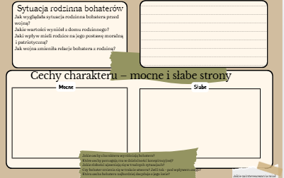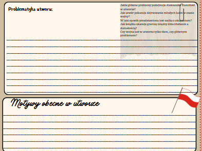 Karta pracy służy do analizy lektury „Kamienie na szaniec” jako całości. Uczniowie rozpoznają gatunek utworu, interpretują tytuł, określają czas i miejsce akcji, wskazują główne motywy, problematykę oraz przesłanie książki. Zadania rozwijają umiejętność pracy z tekstem i formułowania wniosków, przygotowując uczniów do wypowiedzi pisemnych i egzaminu ósmoklasisty.