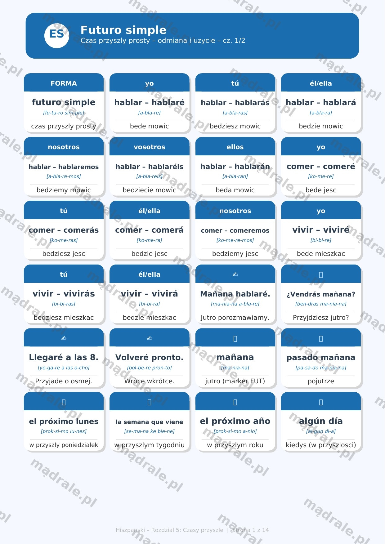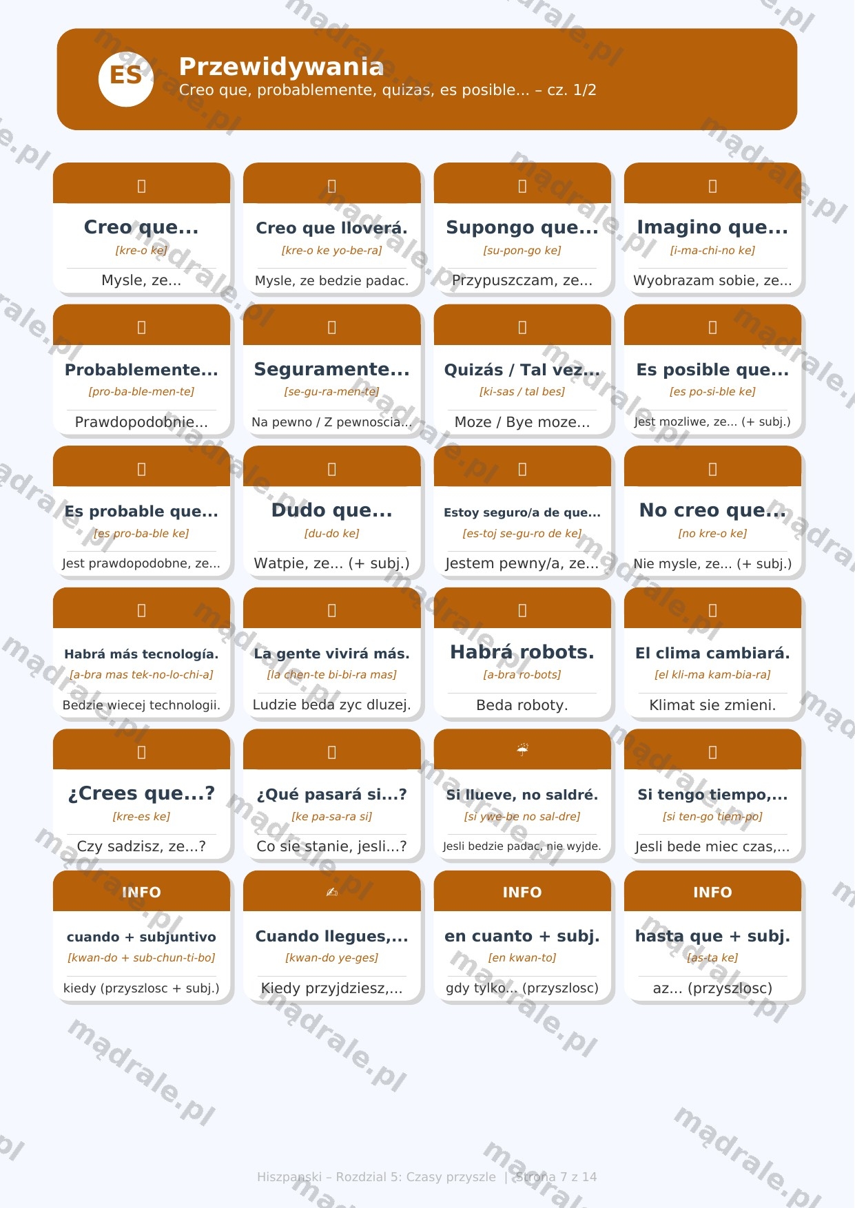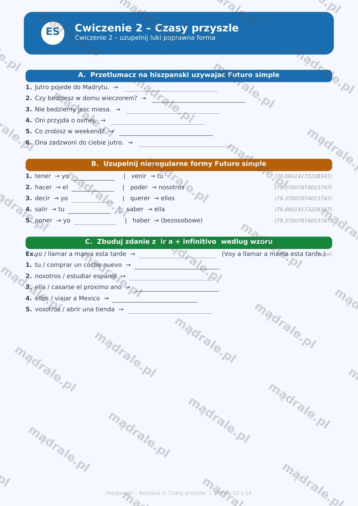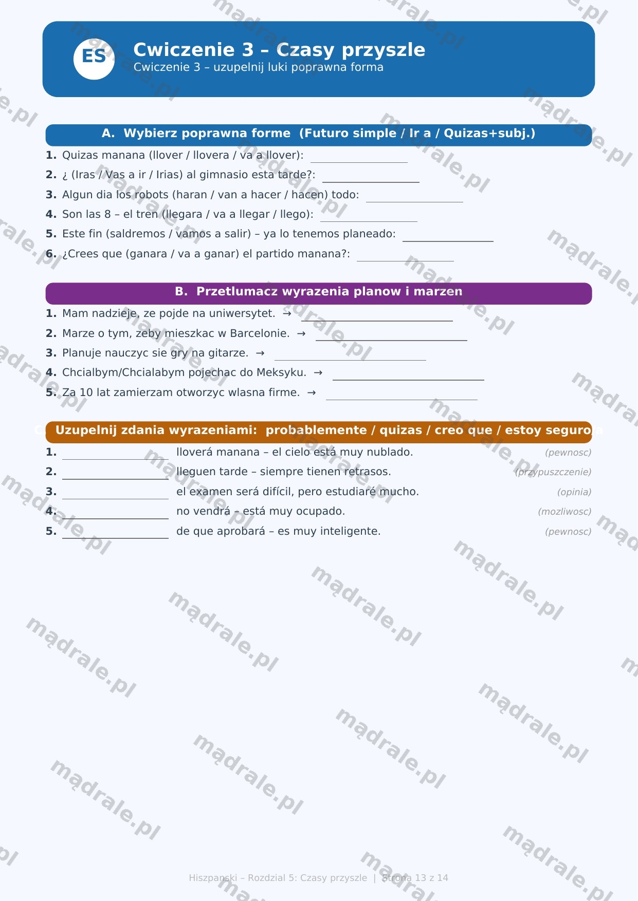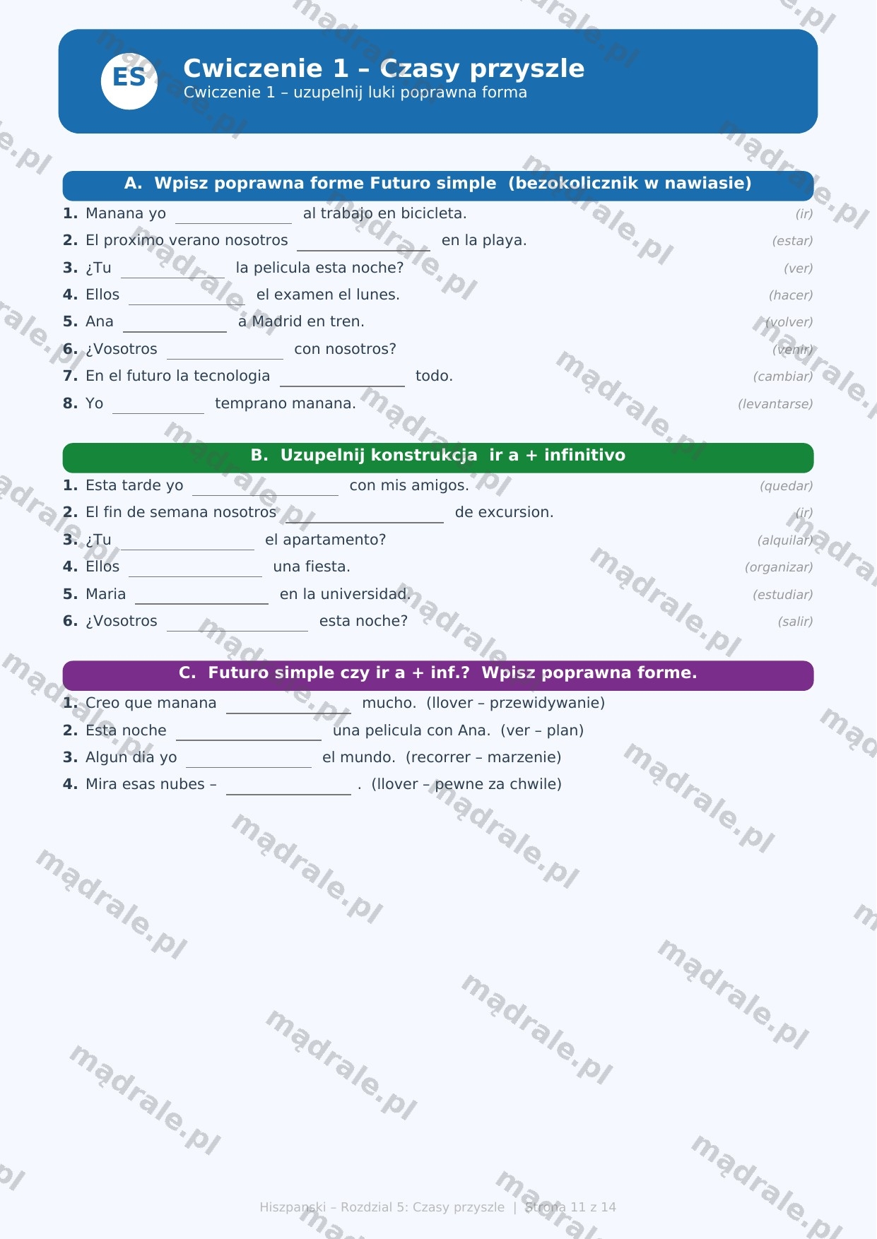 🇪🇸 Kartę pracy z zadaniami dydaktycznymi dotyczącymi czasów przyszłych w języku hiszpańskim – Rozdział 5 (m.in. futuro simple, konstrukcja ir a + infinitivo, wyrażanie planów i przewidywań).