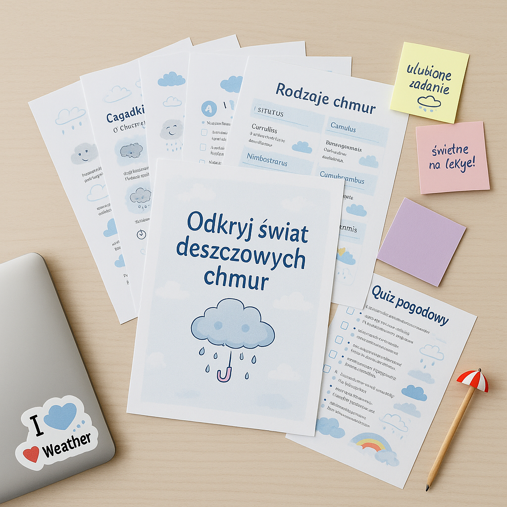 „Odkryj świat deszczowych chmur” to wyjątkowa karta pracy w formacie PDF (6 stron) stworzona z myślą o dzieciach w wieku 6–12 lat. Idealna dla nauczycieli, edukatorów i rodziców, którzy chcą w ciekawy i angażujący sposób przybliżyć dzieciom fascynujący świat pogody, chmur i zjawisk atmosferycznych.