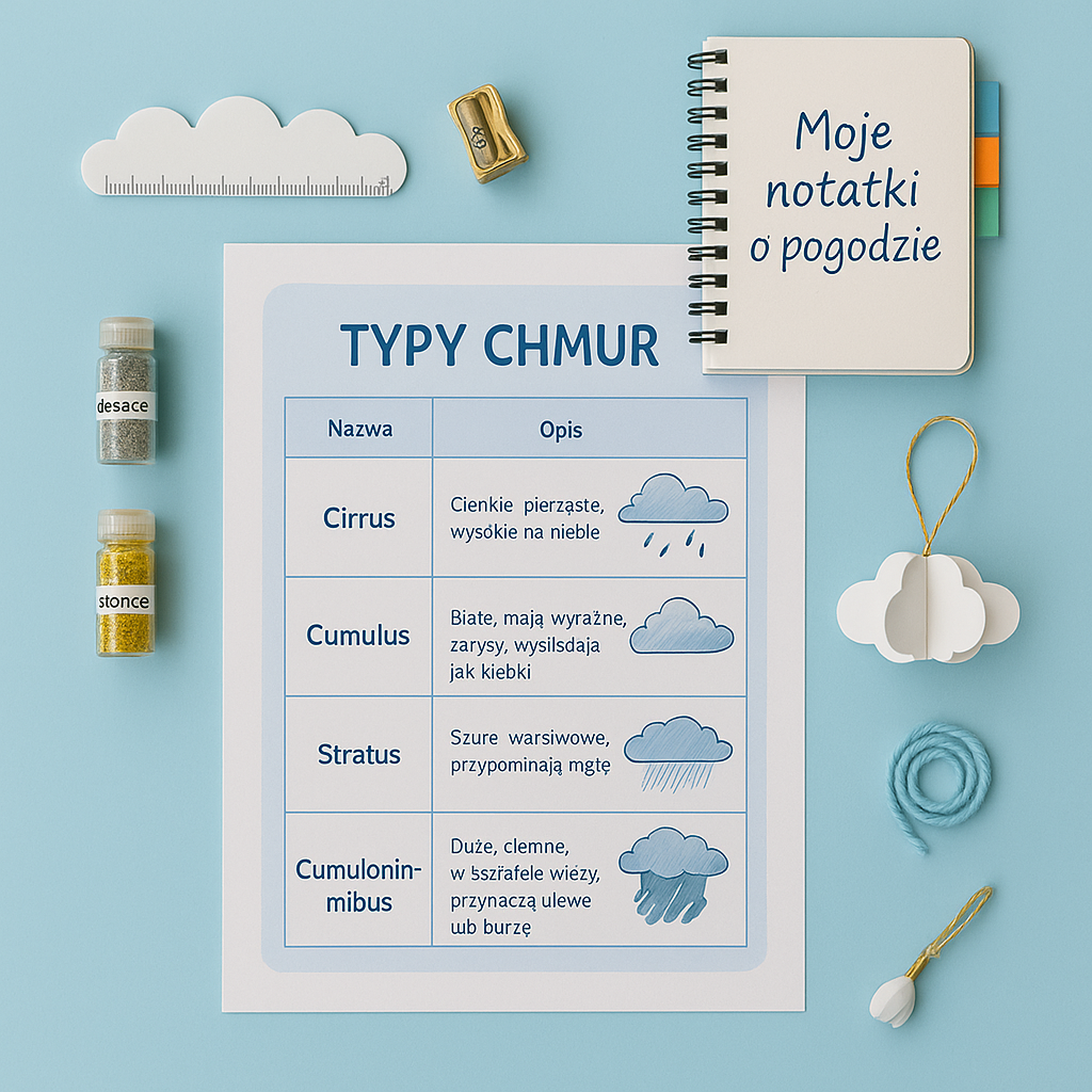 🎨 Zadanie kreatywne – dzieci tworzą własną chmurę, nadają jej imię, opisują i rysują pogodę.