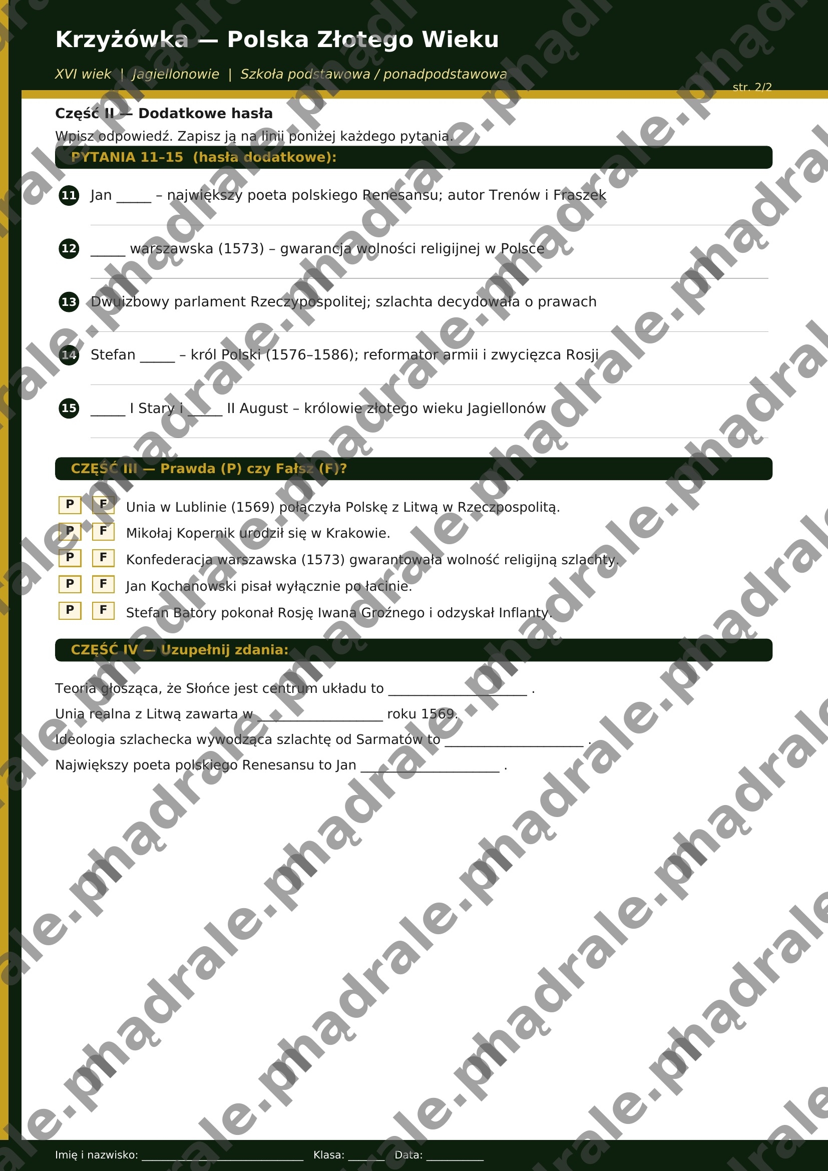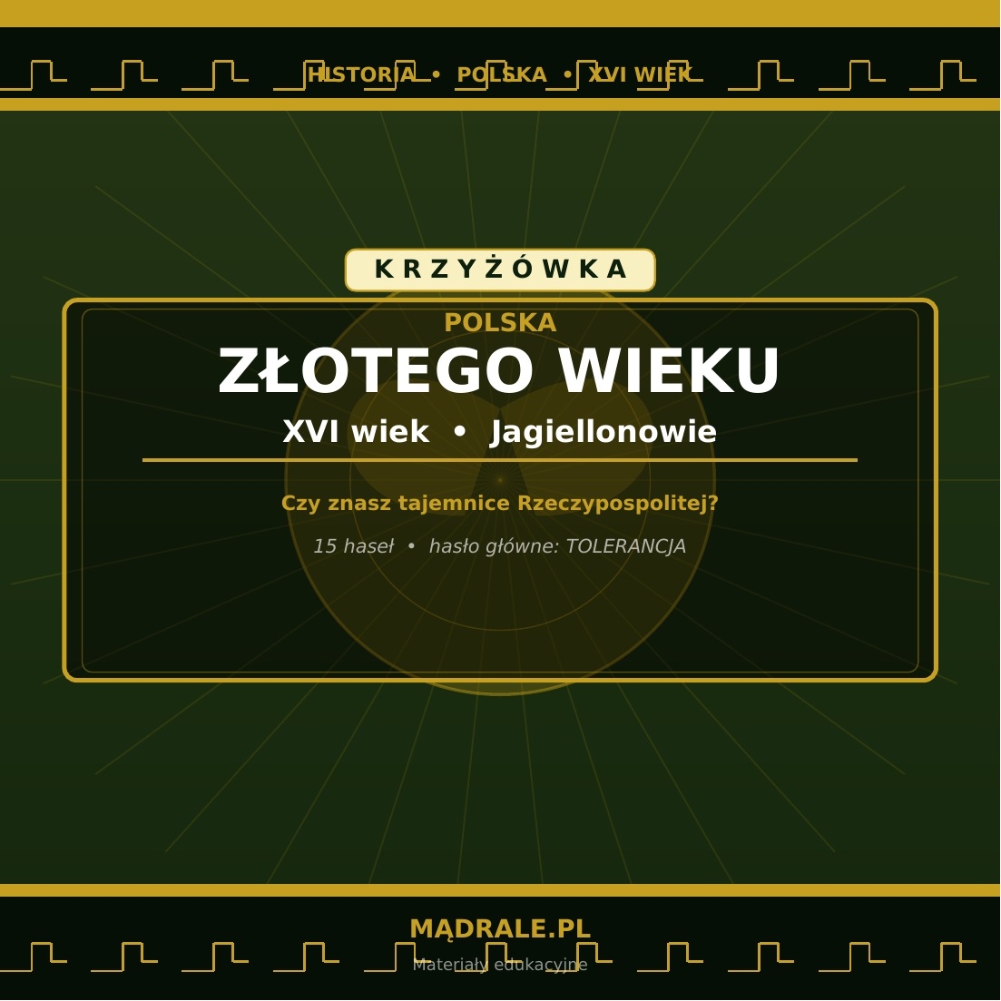🧩 Krzyżówkę tematyczną oraz kartę pracy dotyczącą Polski złotego wieku (m.in. rozwój kultury, demokracja szlachecka, ważne postacie i wydarzenia).