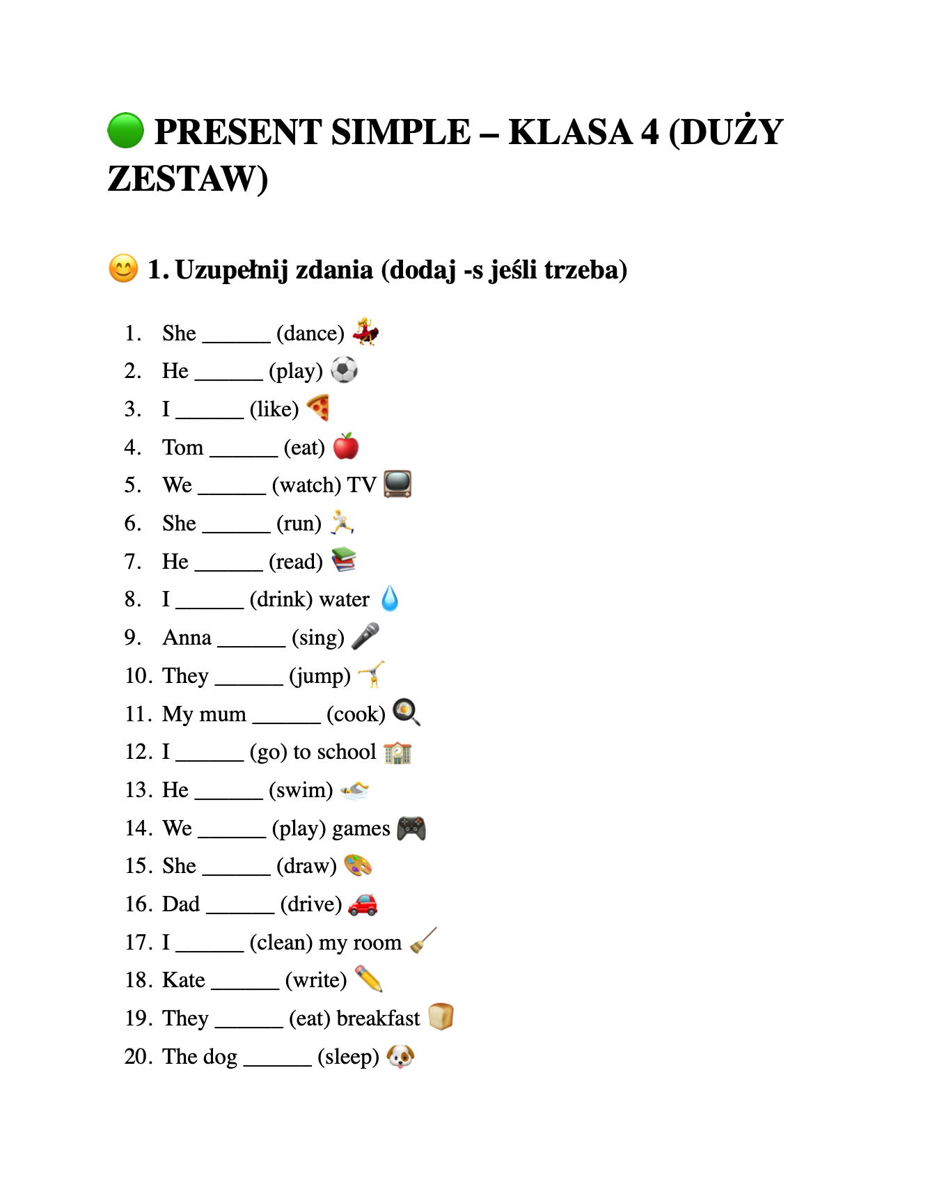 Karty pracy zostały przygotowane z myślą o uczniach klasy 4 szkoły podstawowej i skupiają się na utrwaleniu czasu Present Simple poprzez różnorodne ćwiczenia (uzupełnianie zdań, wybór poprawnej formy, tworzenie pytań i przeczeń).