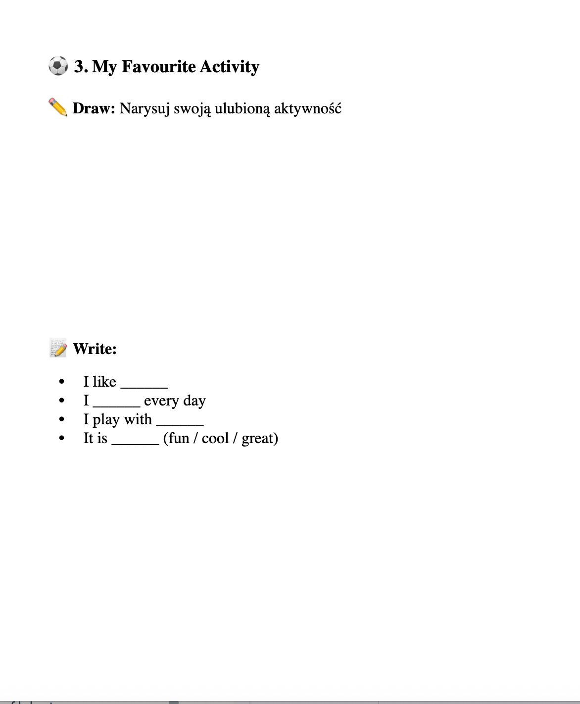 Dodatkowym elementem są zadania typu Draw & Write, które łączą rysowanie z prostym pisaniem, rozwijając kreatywność oraz umiejętność budowania krótkich wypowiedzi w języku angielskim.