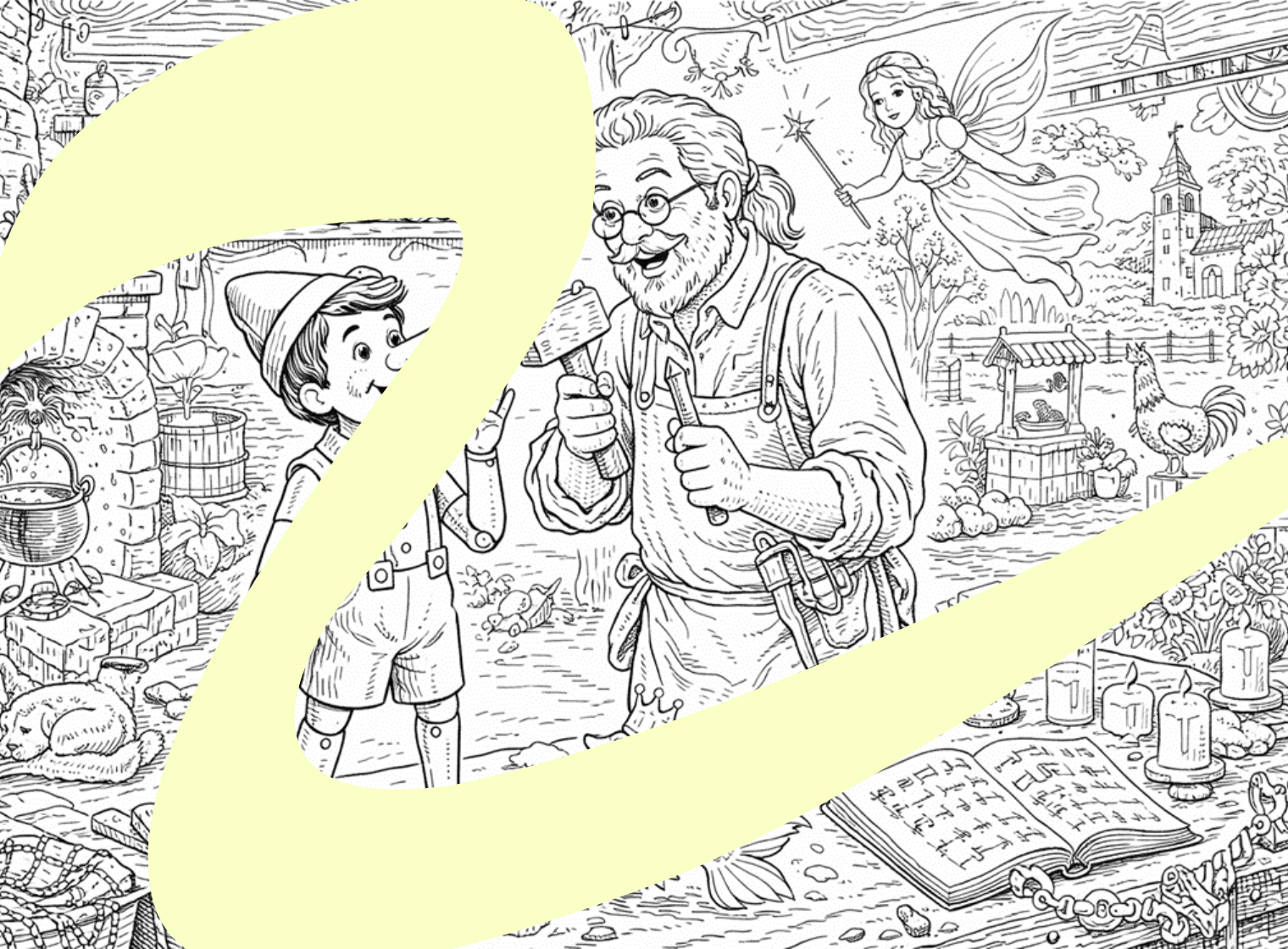 „Kolorowanka – Pinokio” to atrakcyjny rysunek kolorowania, przedstawiający drewnianego pajacyka ożywionego przez Błękitną Wróżkę.