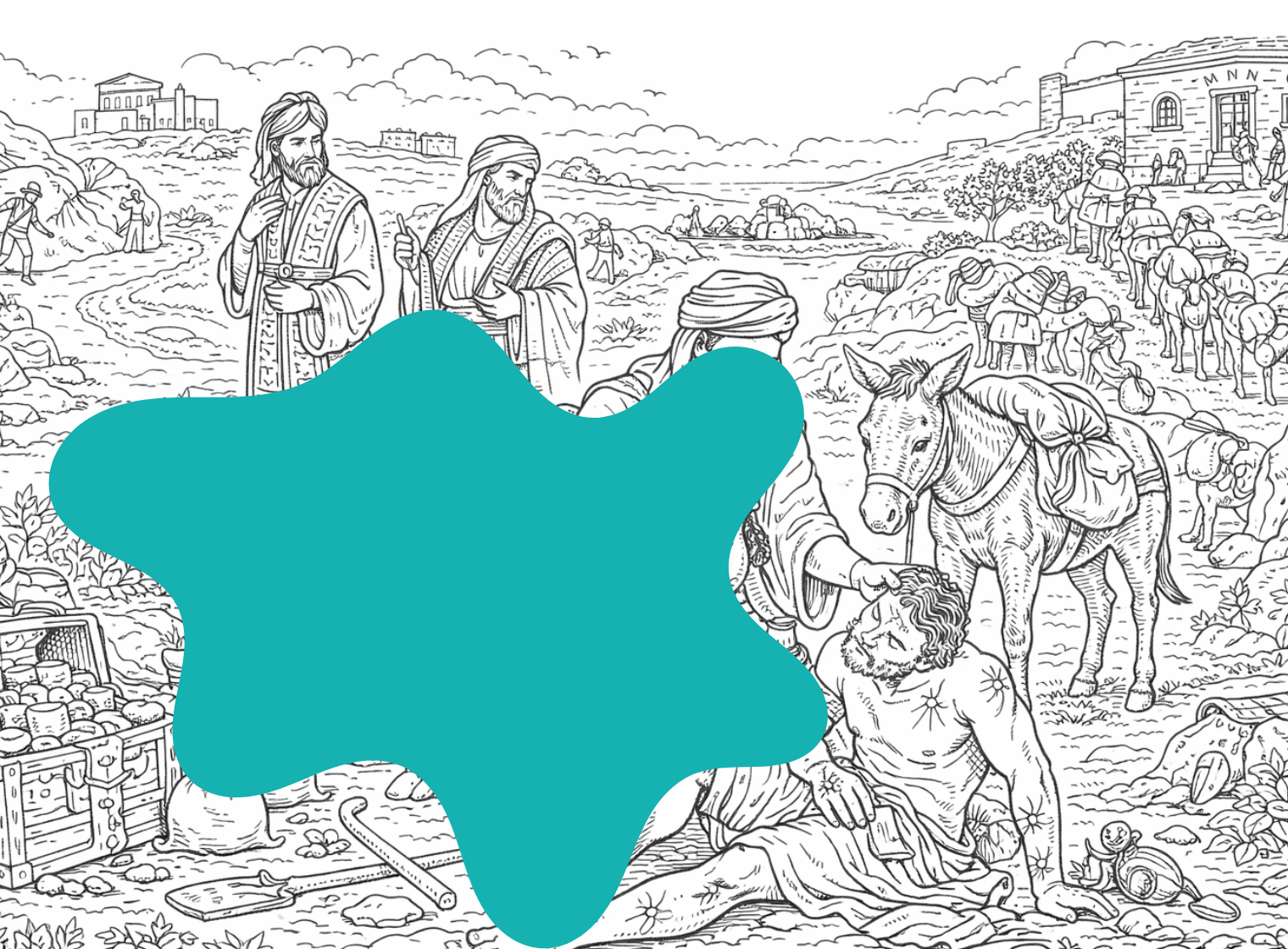 „Kolorowanka – przypowieść o miłosiernym Samarytaninie” to kolorowanka inspirowana biblijną historią o pomocnym wędrowcu niosącym ratunek pobitemu podróżnikowi.