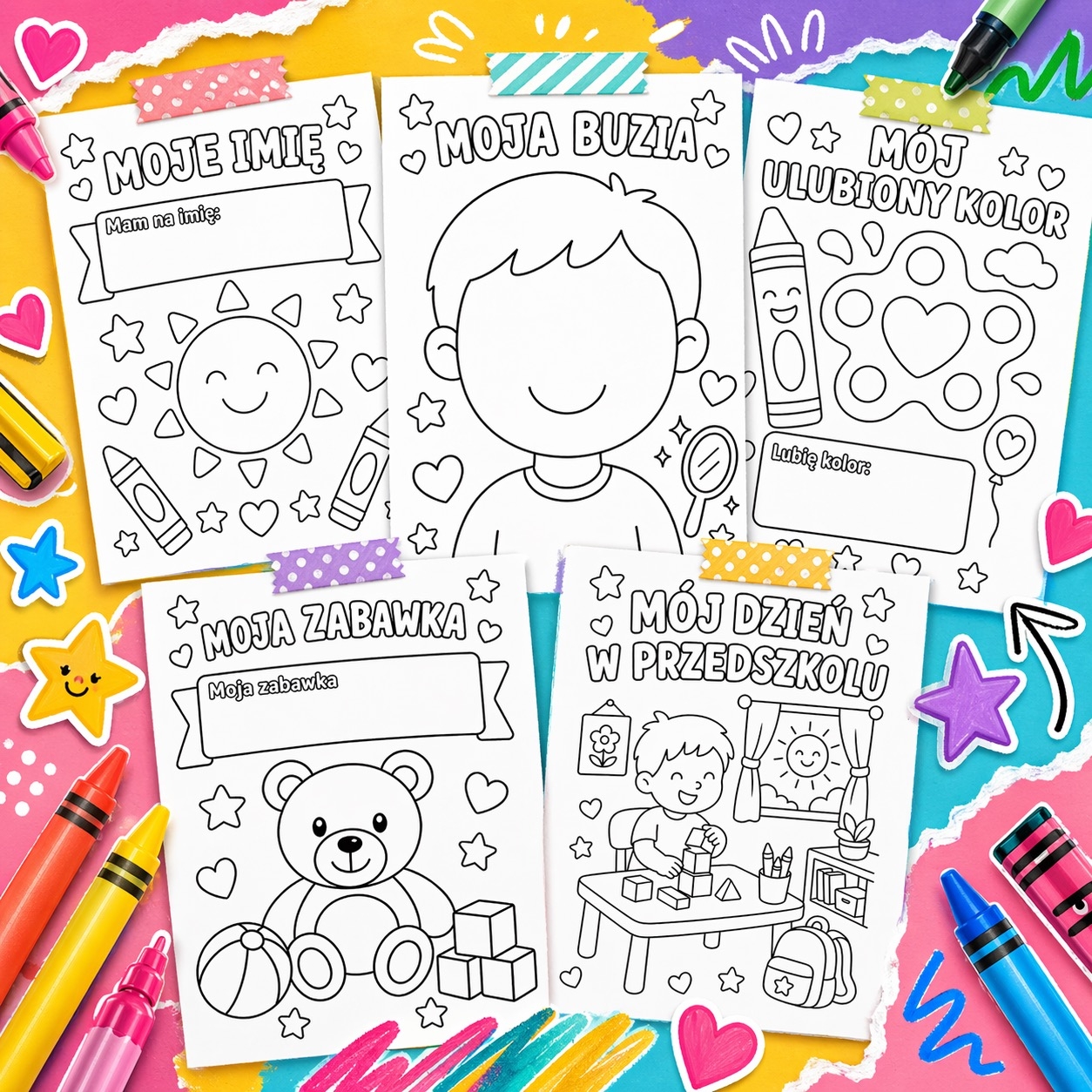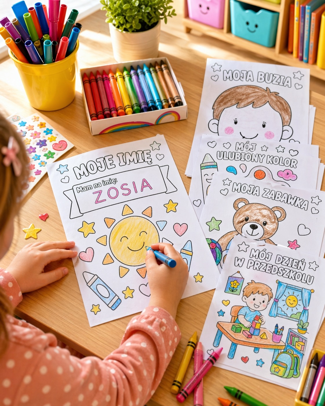Materiał świetnie sprawdzi się w przedszkolu, w edukacji wczesnodziecięcej, podczas zajęć adaptacyjnych, tematycznych lub jako spokojna aktywność plastyczna. Proste ilustracje zachęcają do działania, a personalizowany charakter sprawia, że każda kolorowanka staje się wyjątkowa 🌈🖍️