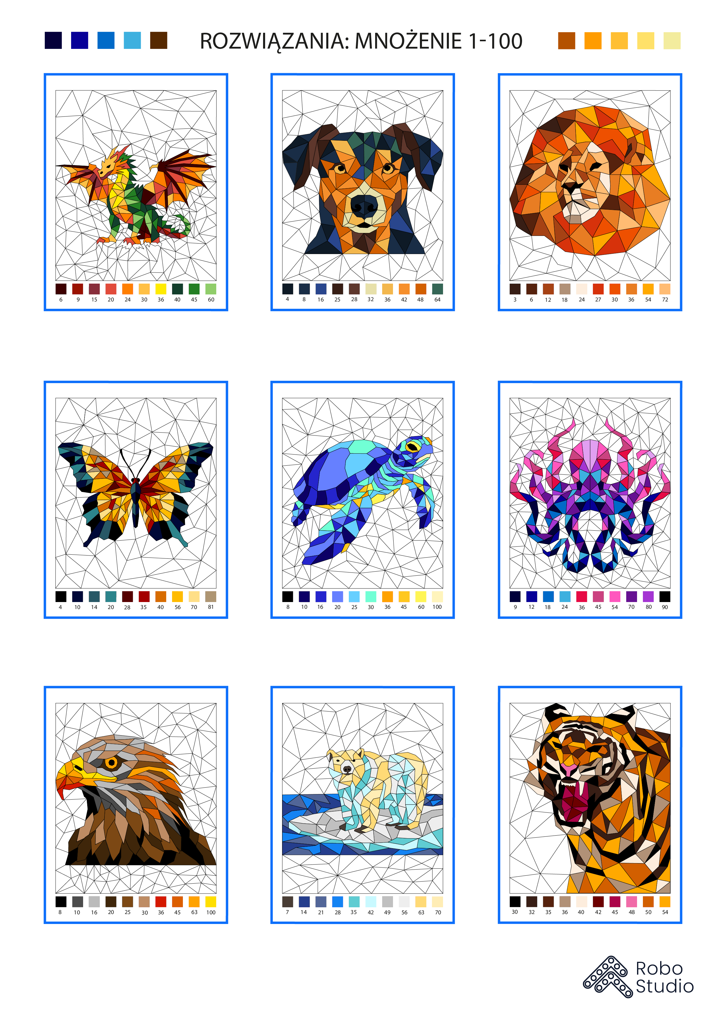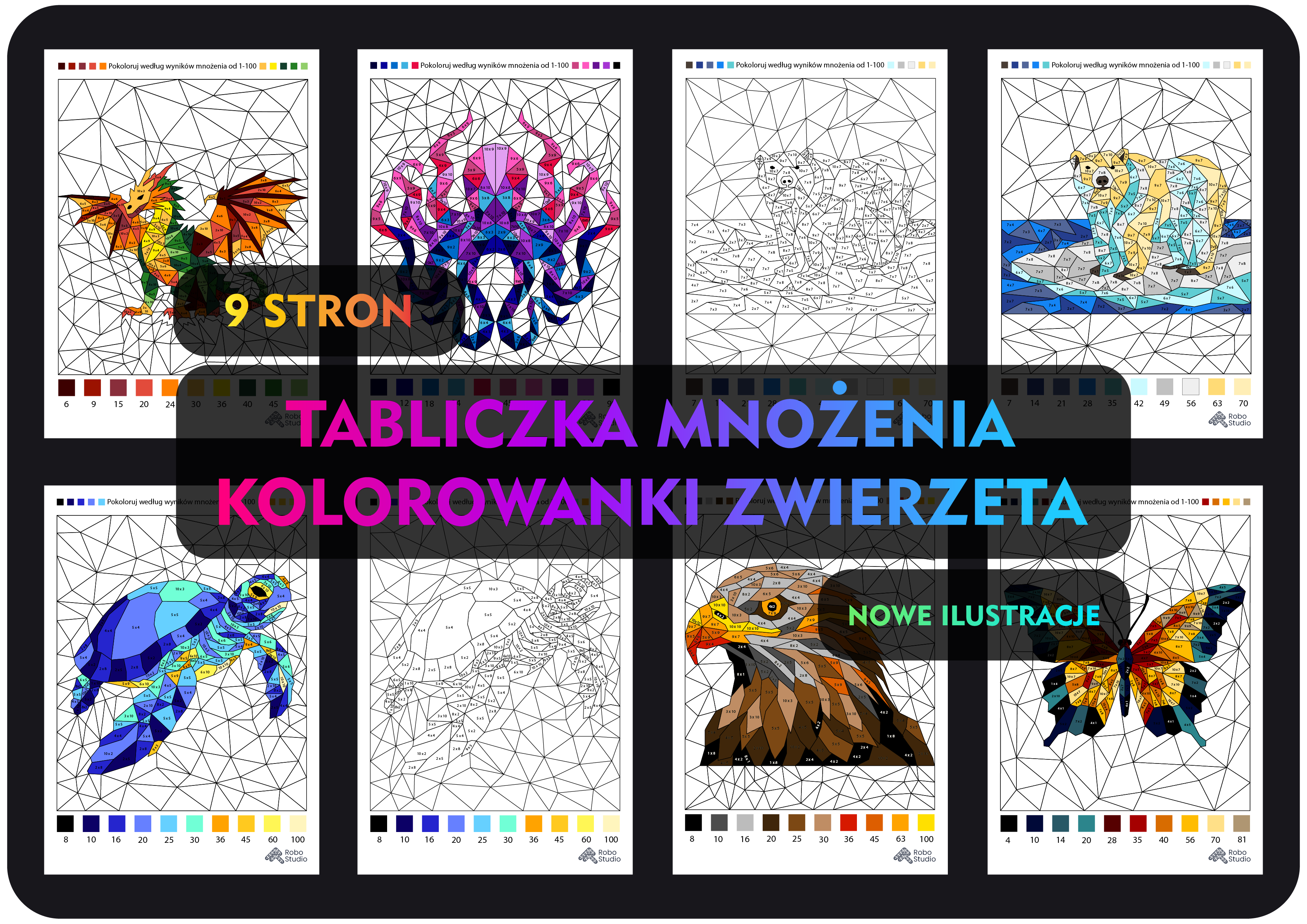 ✔ 9 kart pracy – każda strona to osobna kolorowanka do mnożenia przez różne liczby od 1-100