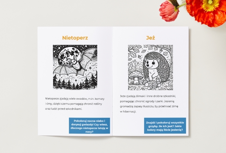 Wstęp, spis treści i aż 10 kart z różnymi zwierzętami (m.in. pszczoła, żaba, wilk, jeż, bocian…).