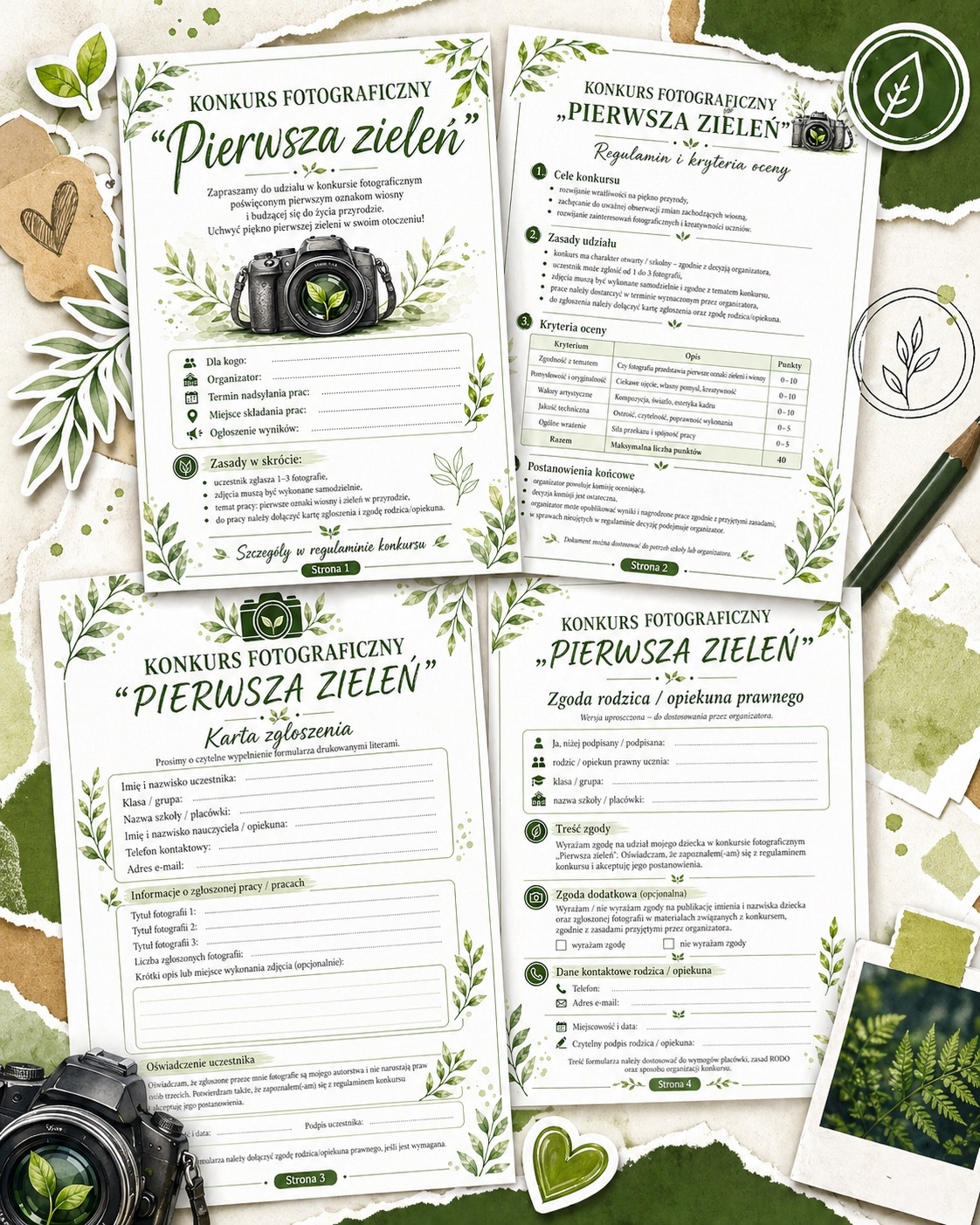 W materiale znajduje się plakat konkursowy, regulamin z kryteriami oceny, karta zgłoszenia oraz uproszczona zgoda rodzica/opiekuna prawnego do dostosowania. Całość została przygotowana w spójnej, wiosennej oprawie graficznej z motywem aparatu i listka wyrastającego z obiektywu. 📷🍃