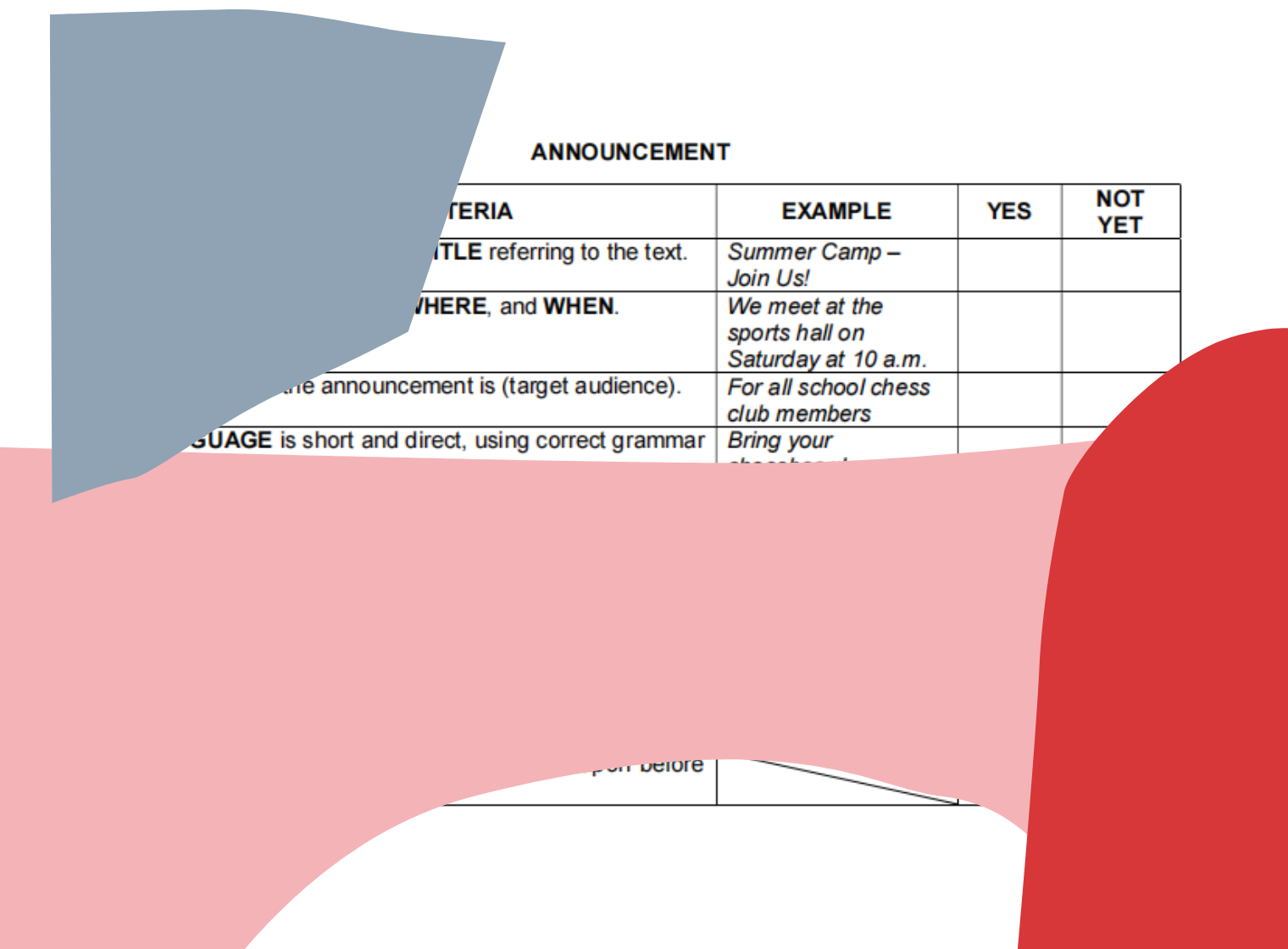 If you are interested in the criteria for all writing forms for grades 7–8, not only for an announcement, you can purchase them here as a set here: https://zlotynauczyciel.pl/downloads/kryteria-pisania-na-jezyku-angielskim-klasa-vii-viii-criteria-writing-in-english-grades-7-8/