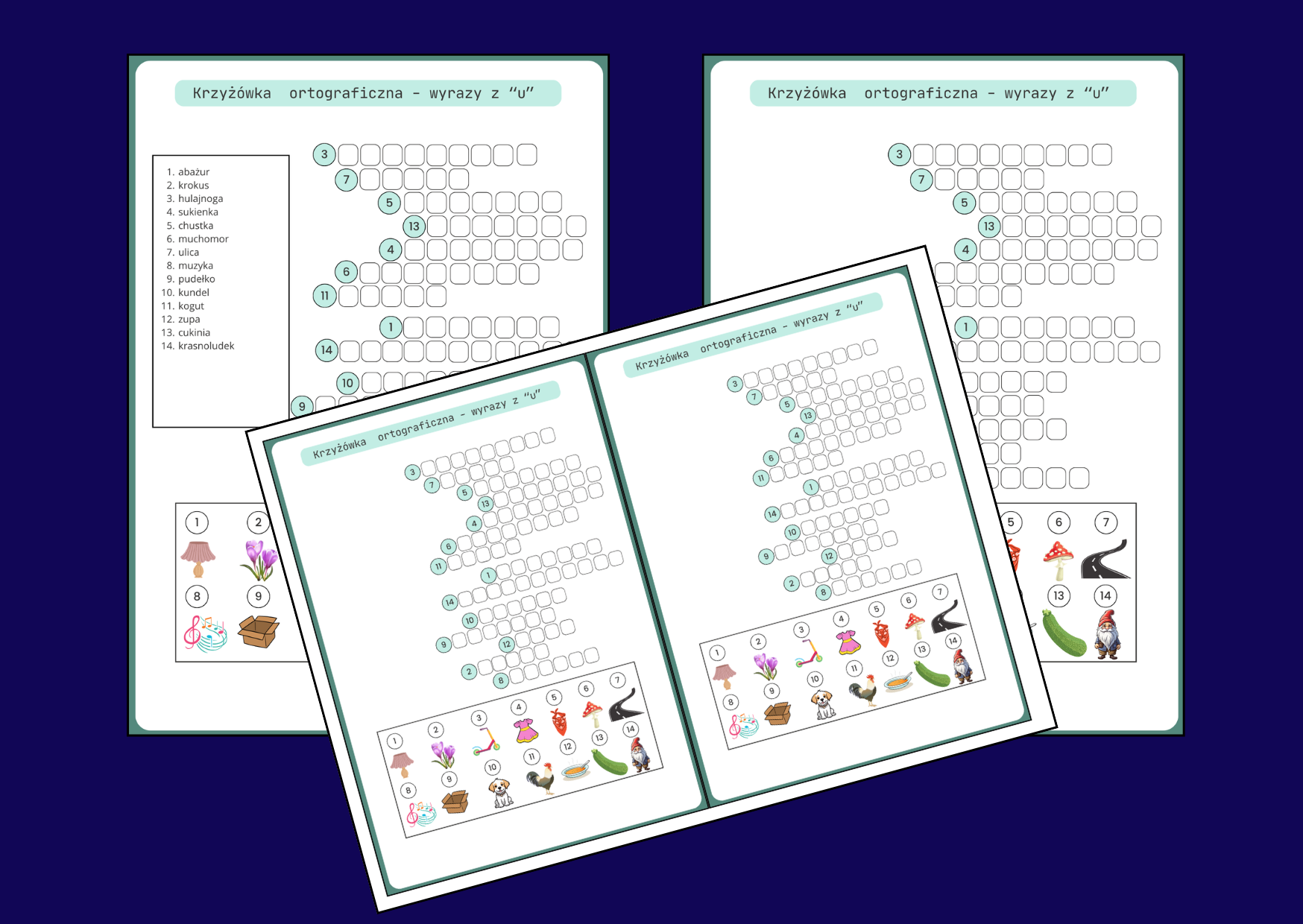 Krzyżówka obrazkowa dotycząca wyrazów z "u". Po rozwiązaniu wpisane słowa można wykorzystać np. do ćwiczeń ortograficznych lub redakcyjnych.
