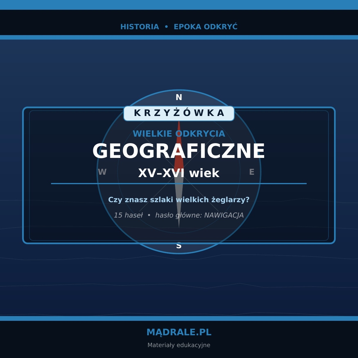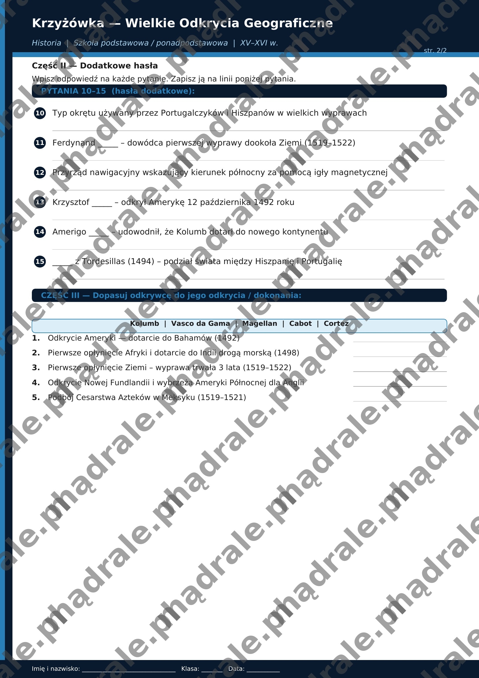 🧭 Krzyżówkę tematyczną dotyczącą wielkich odkryć geograficznych (m.in. Krzysztof Kolumb, Vasco da Gama, Ferdynand Magellan, droga do Indii, odkrycie Ameryki, karawela, konkwistadorzy, Aztekowie i Inkowie).