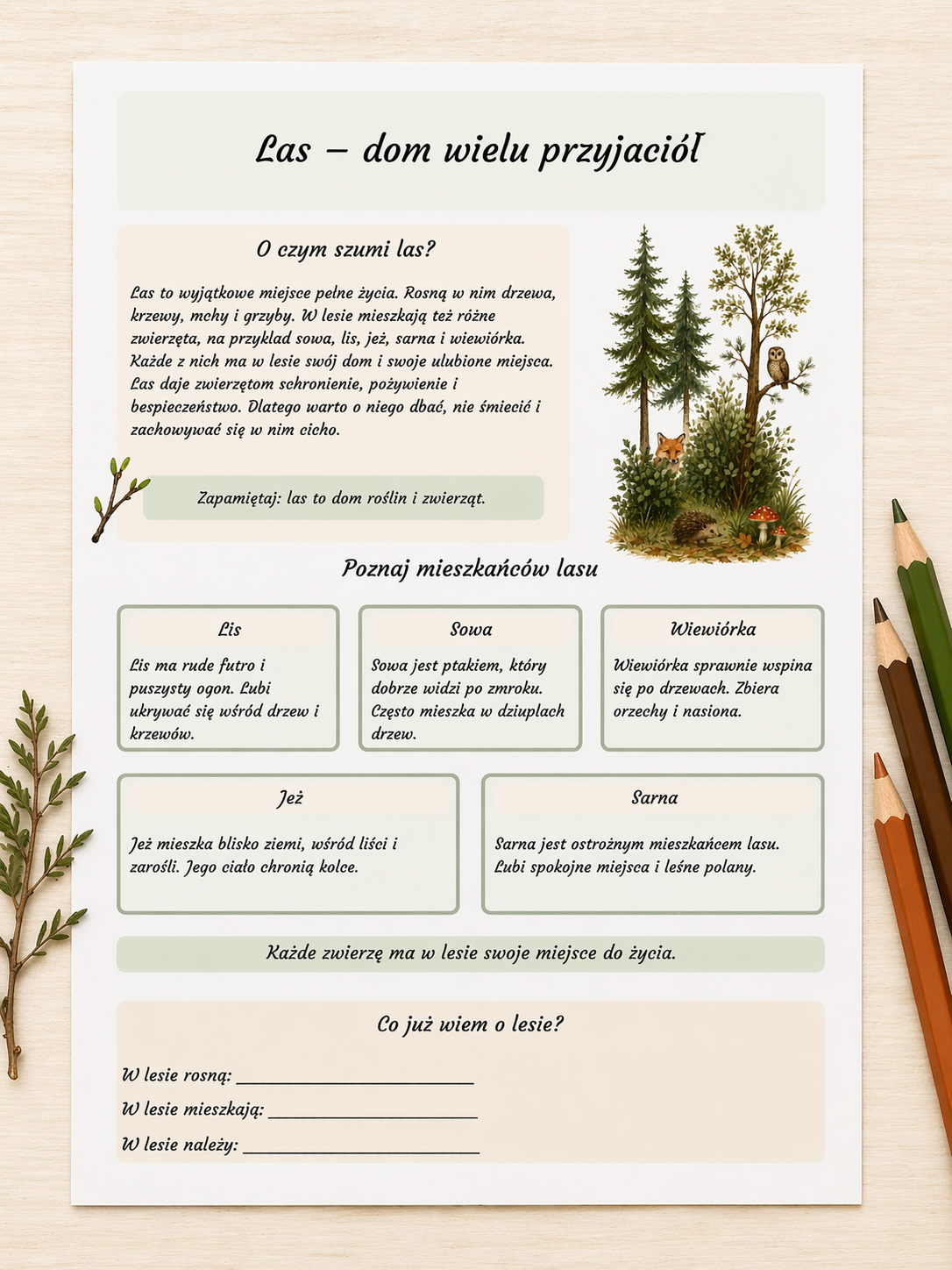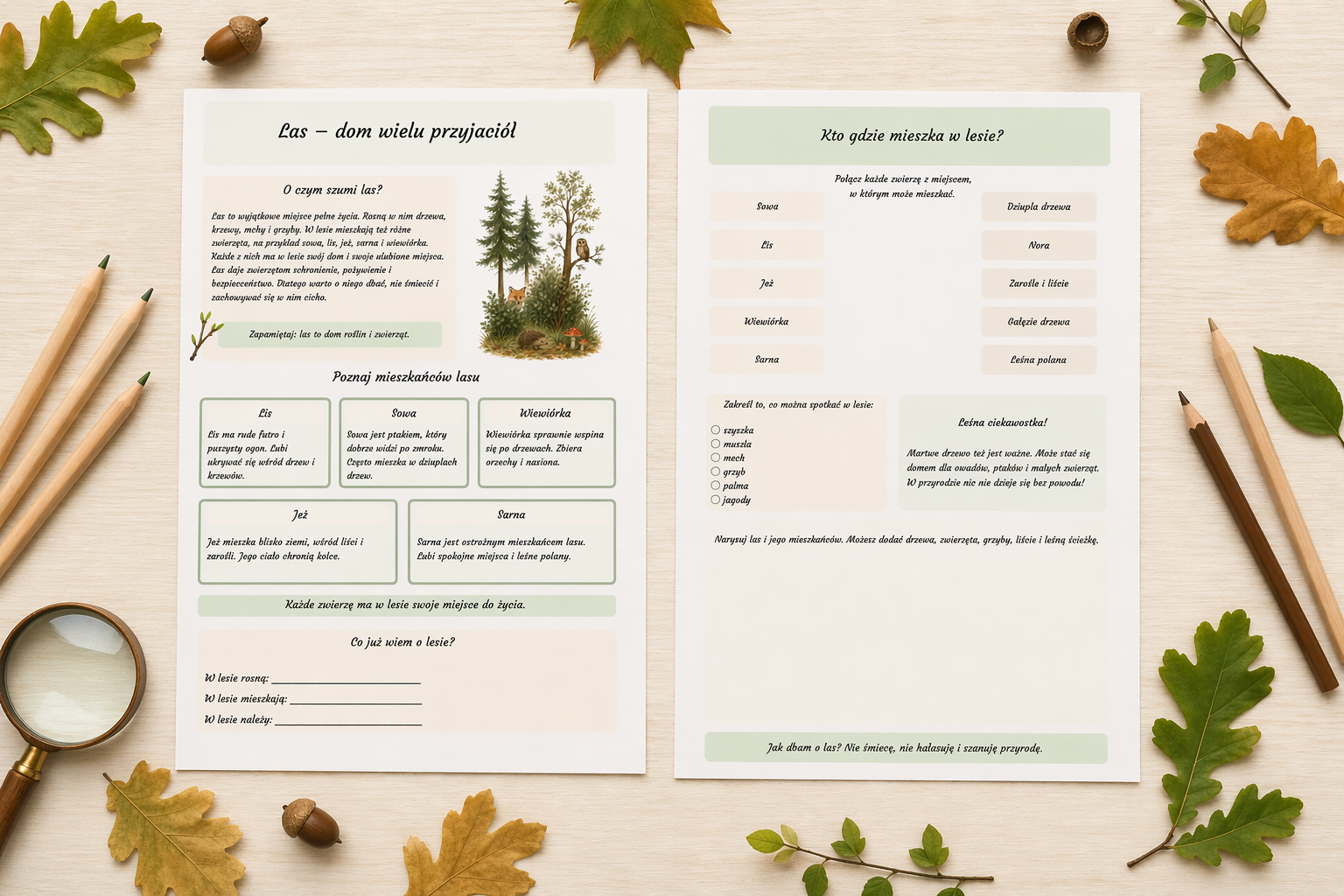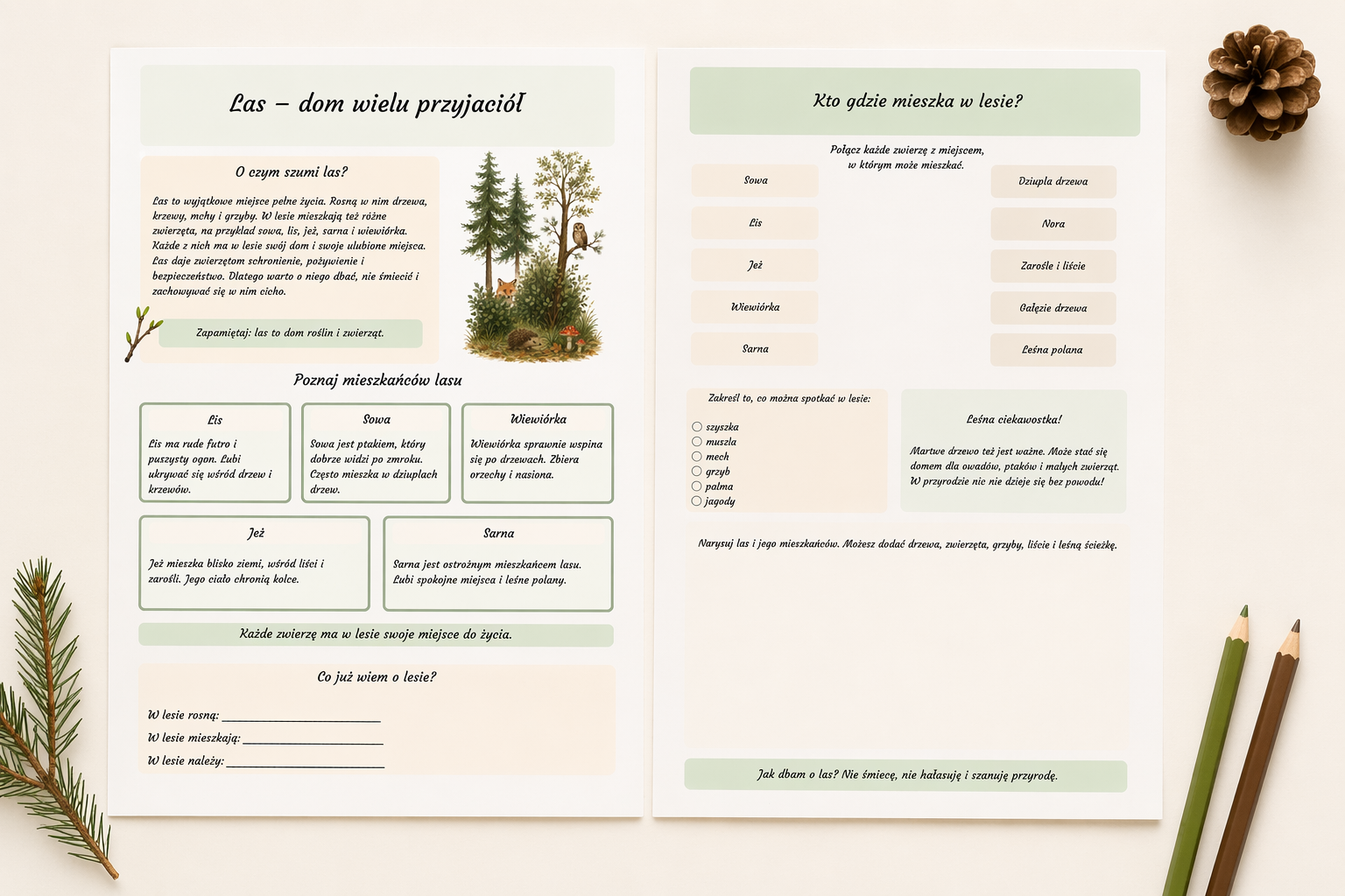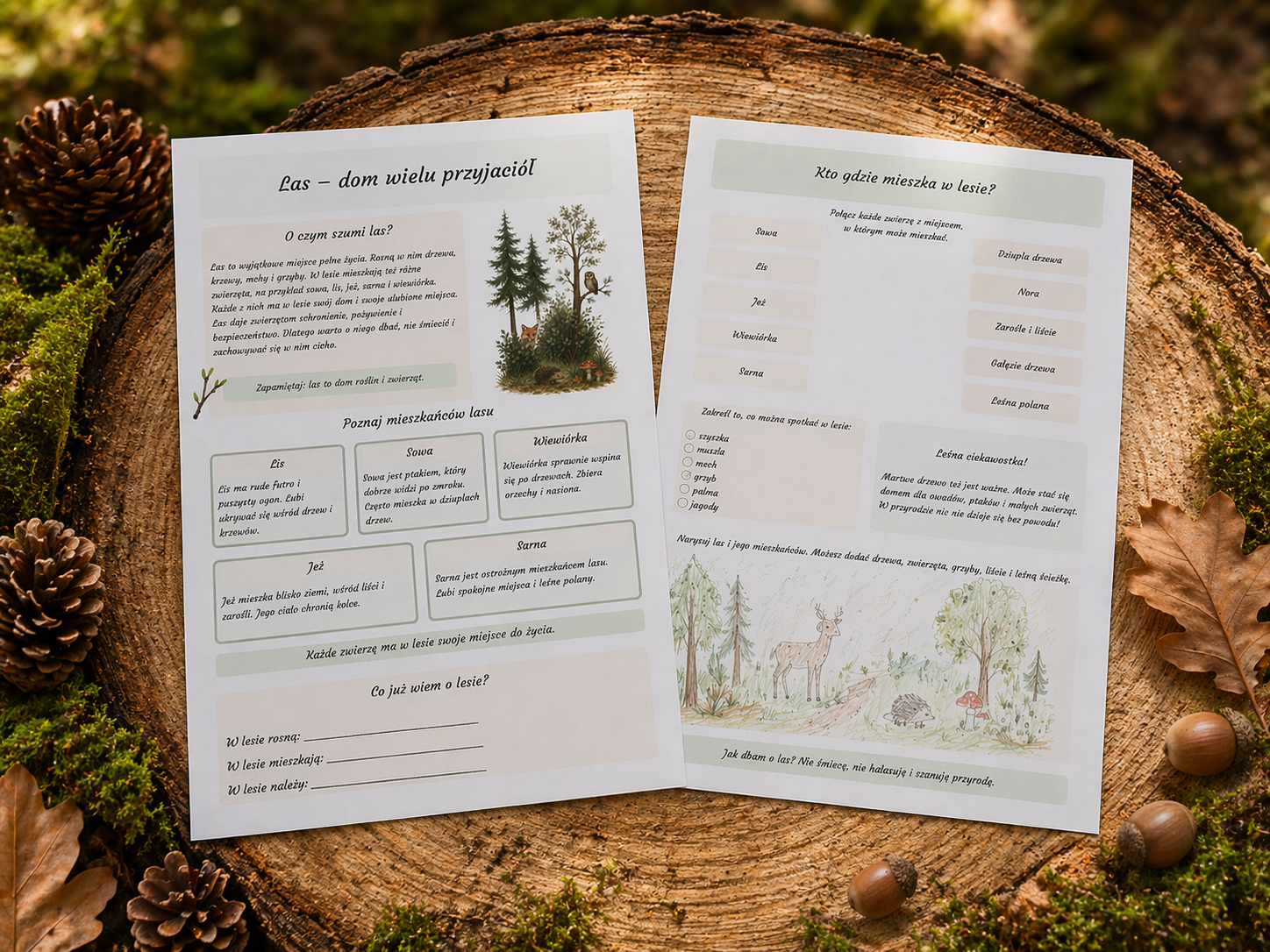 To świetna propozycja na zajęcia przyrodnicze, edukację wczesnoszkolną i rozmowę o szacunku do przyrody 💚 Materiał uczy, że las jest domem roślin i zwierząt, dlatego trzeba o niego dbać, nie śmiecić i zachowywać się cicho 🌳🤍