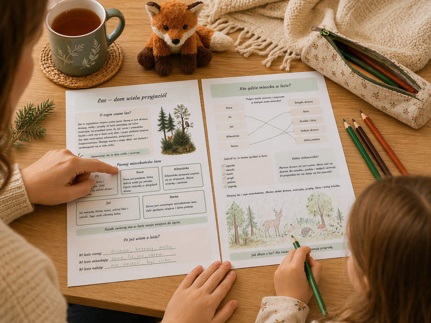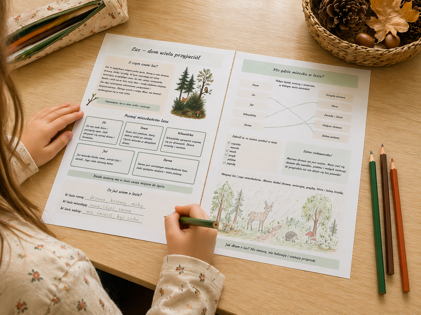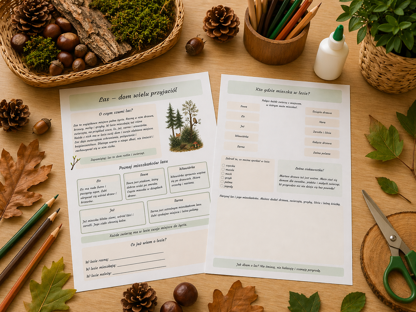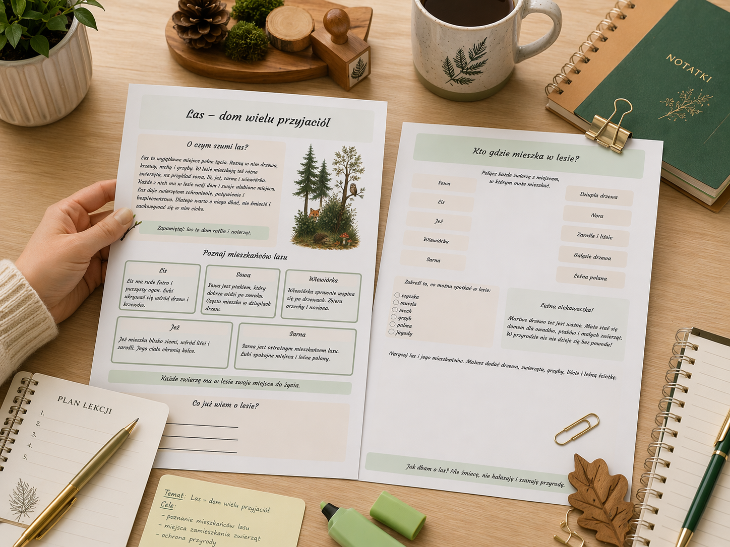 To świetna propozycja na zajęcia przyrodnicze, edukację wczesnoszkolną i rozmowę o szacunku do przyrody 💚 Materiał uczy, że las jest domem roślin i zwierząt, dlatego trzeba o niego dbać, nie śmiecić i zachowywać się cicho 🌳🤍