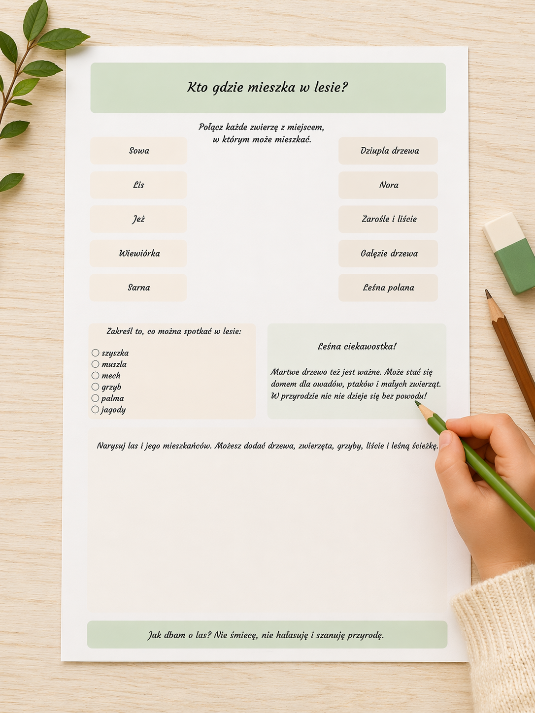 Przygotowałam piękną, spokojną i przyjazną dzieciom kartę pracy o lesie 🌲🍄 To materiał, który pomaga najmłodszym lepiej poznać leśną przyrodę, mieszkańców lasu oraz zasady dbania o naturę. Dzieci poznają takie zwierzęta jak lis, sowa, wiewiórka, jeż i sarna, a także wykonują proste, angażujące zadania: łączą zwierzęta z miejscem życia, zaznaczają elementy spotykane w lesie, uzupełniają zdania i tworzą własny rysunek 🌼✏️