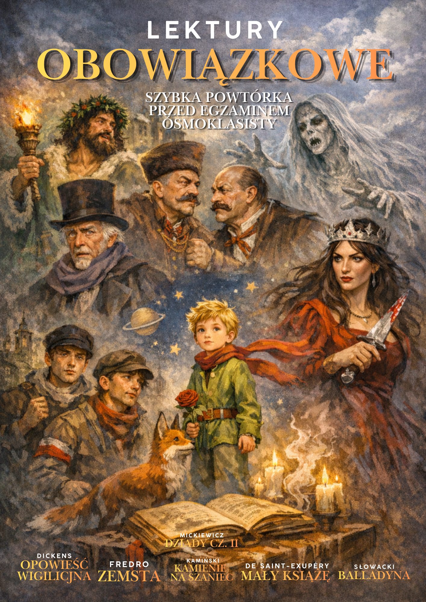 Materiał został przygotowany w prosty i zrozumiały sposób, dzięki czemu szybko uporządkujesz wiedzę i przypomnisz sobie kluczowe wydarzenia z takich utworów jak Mały Książę, Kamienie na szaniec, Zemsta, Opowieść wigilijna, Balladyna czy Dziady cz. II.