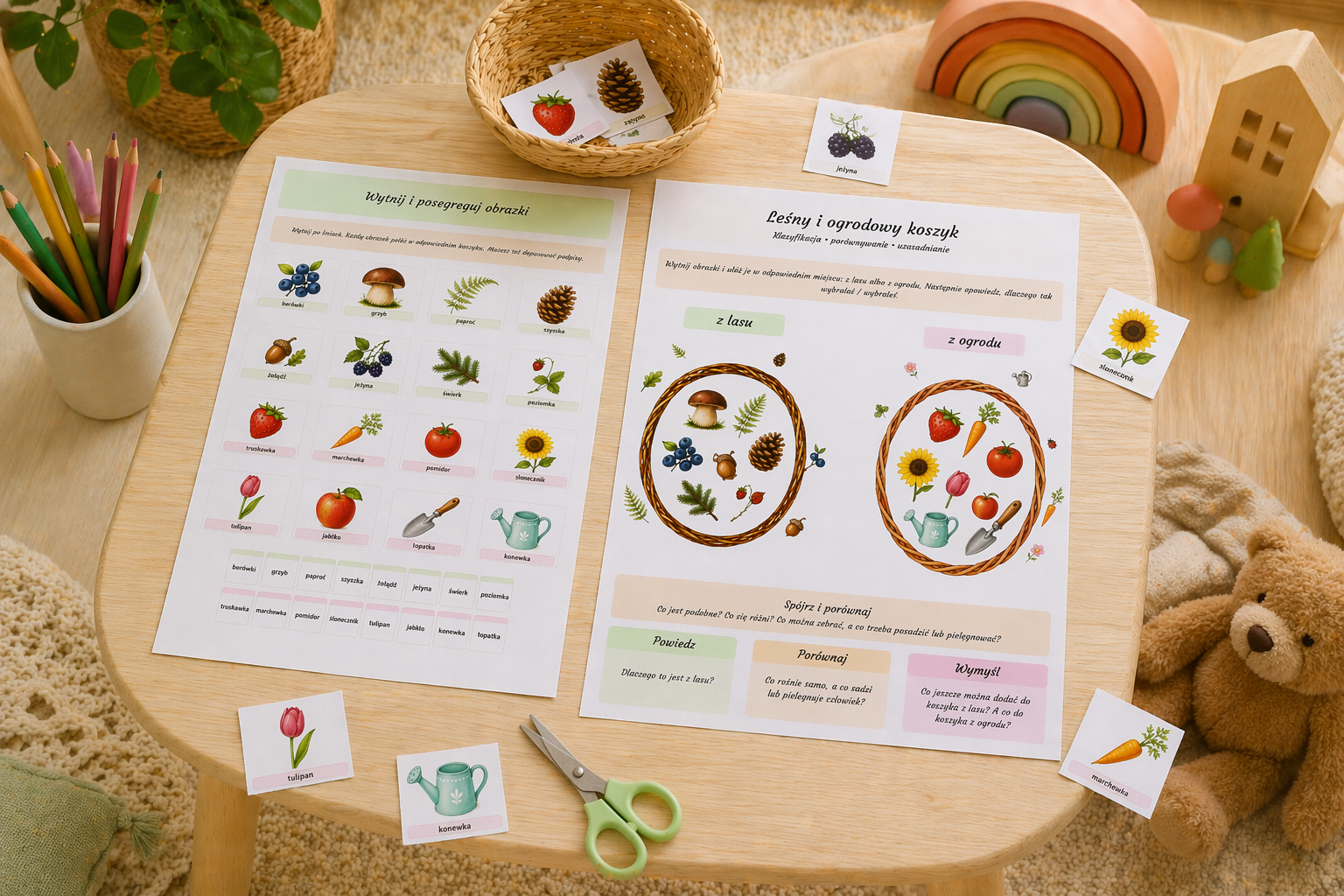 🌟 Druga strona to zestaw pięknych, realistycznych ilustracji (np. borówki, grzyb, paproć, marchewka, pomidor, konewka), które dzieci wycinają i przyporządkowują do odpowiednich kategorii.