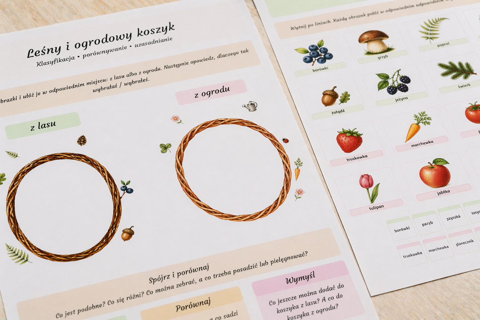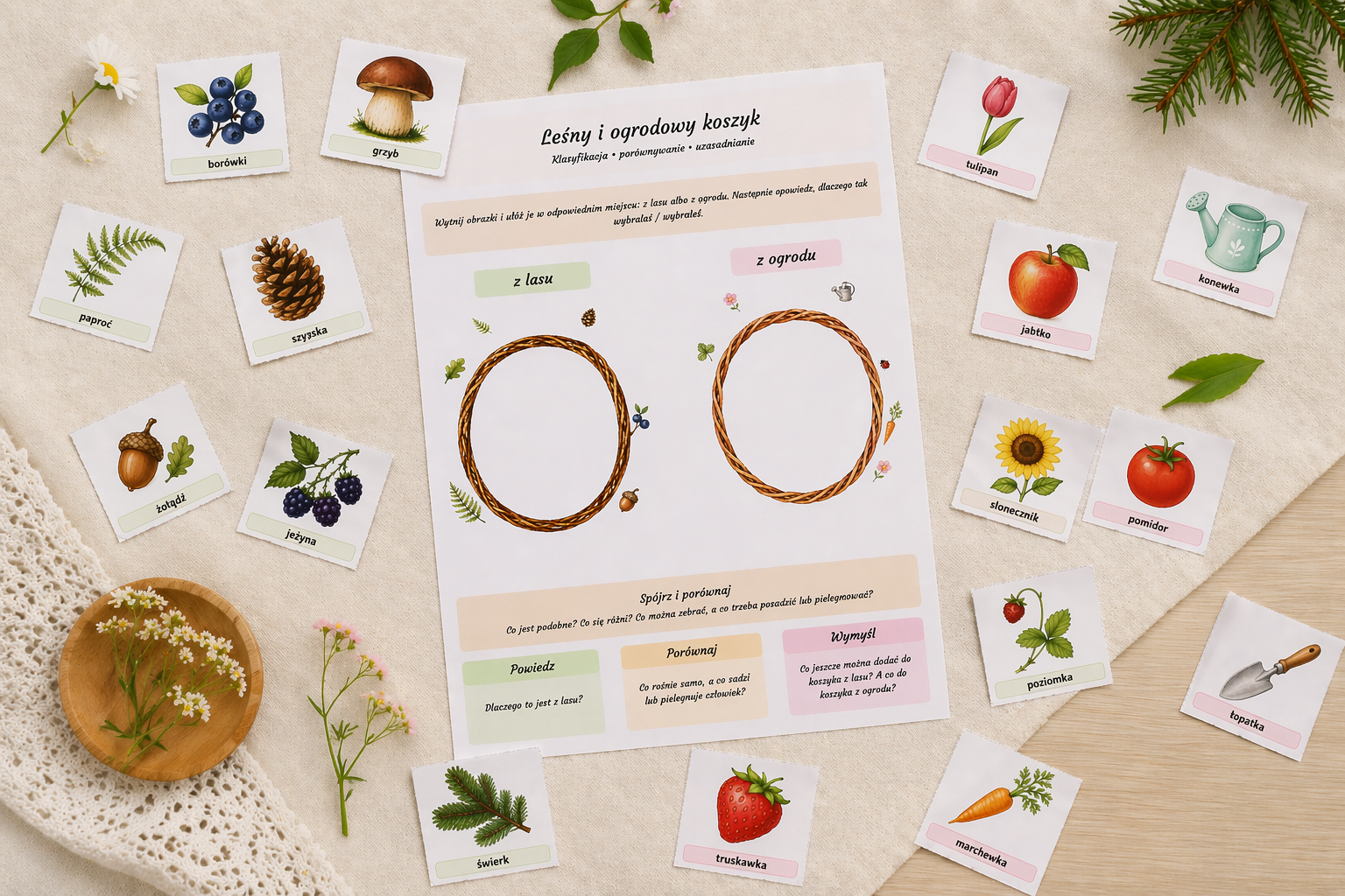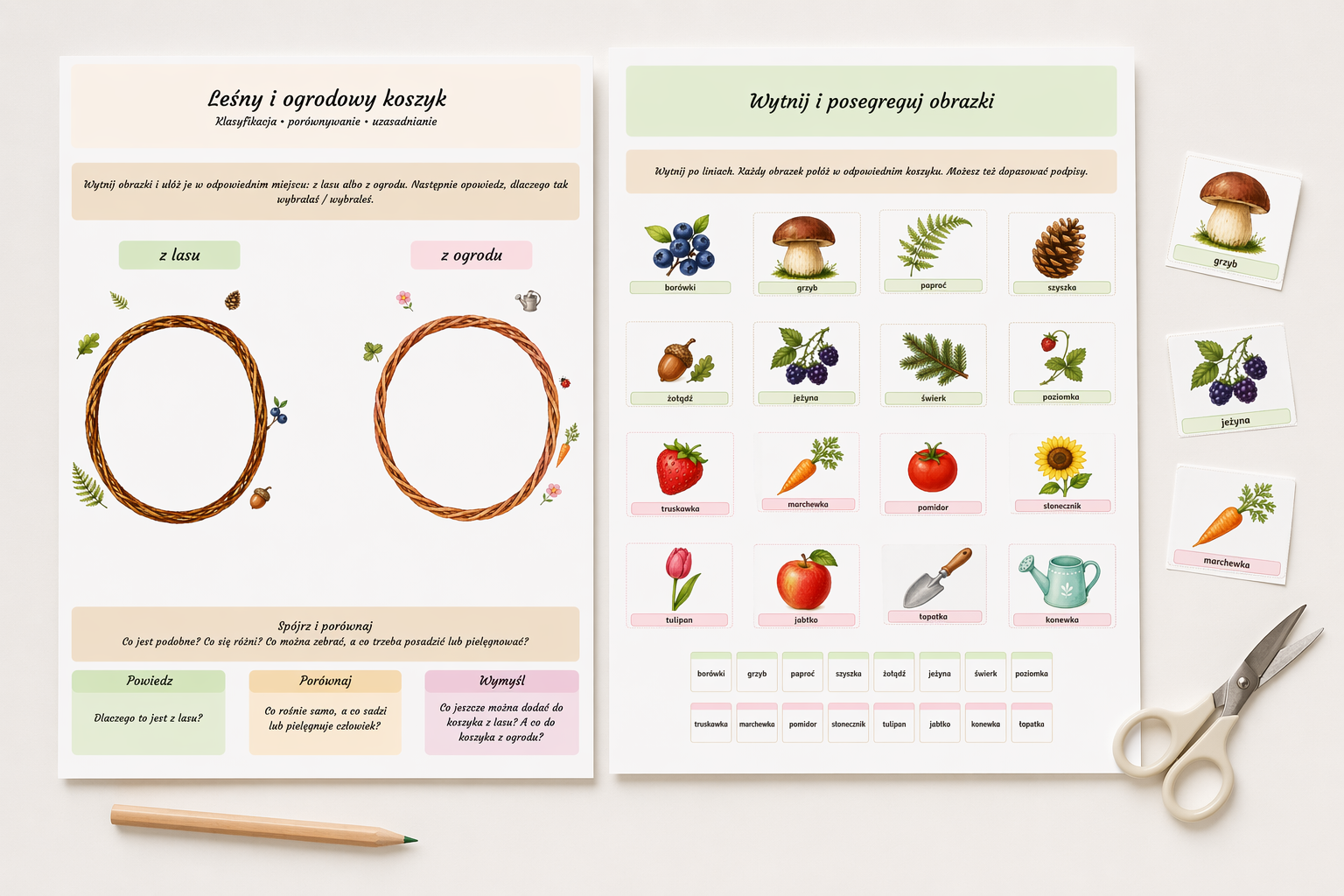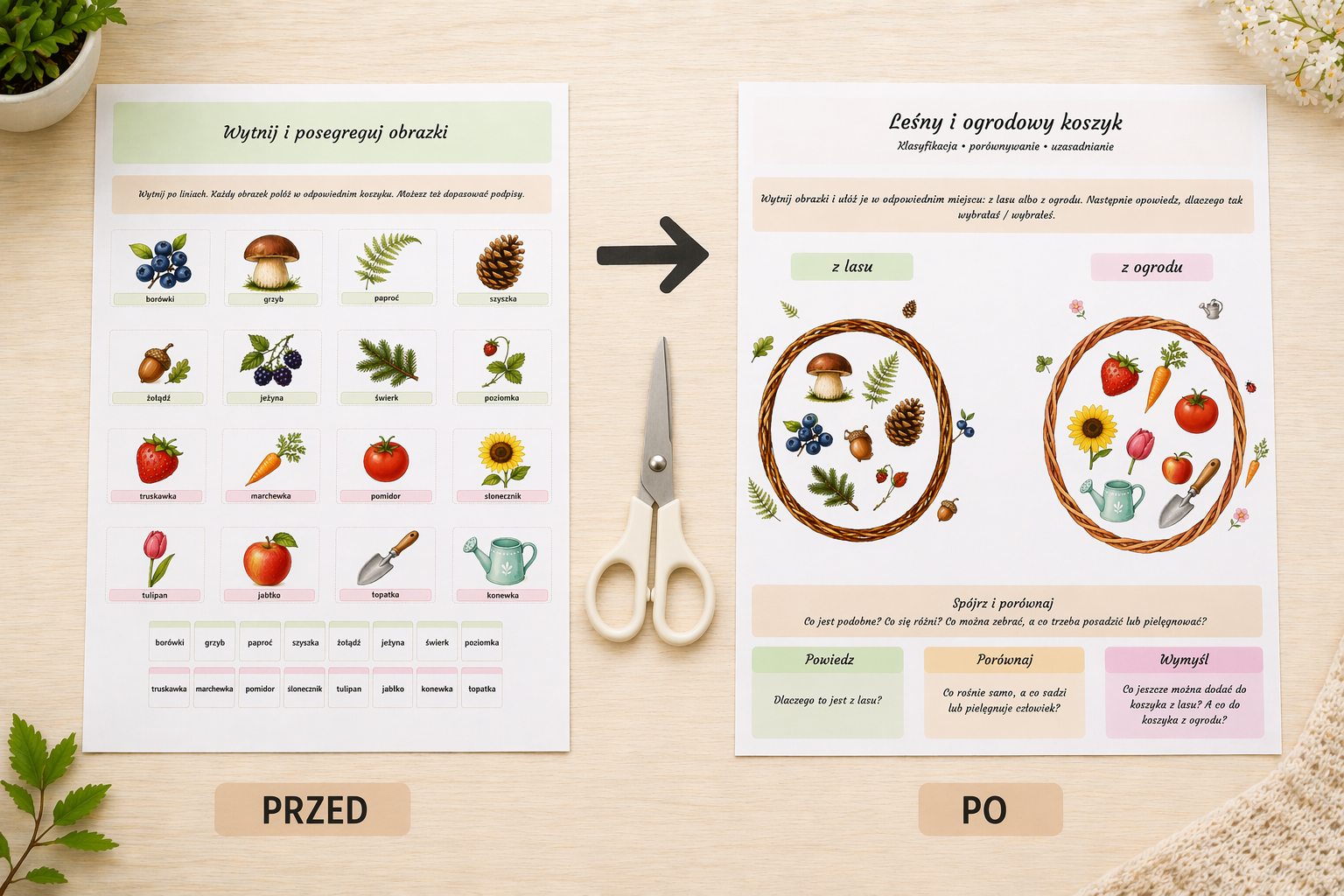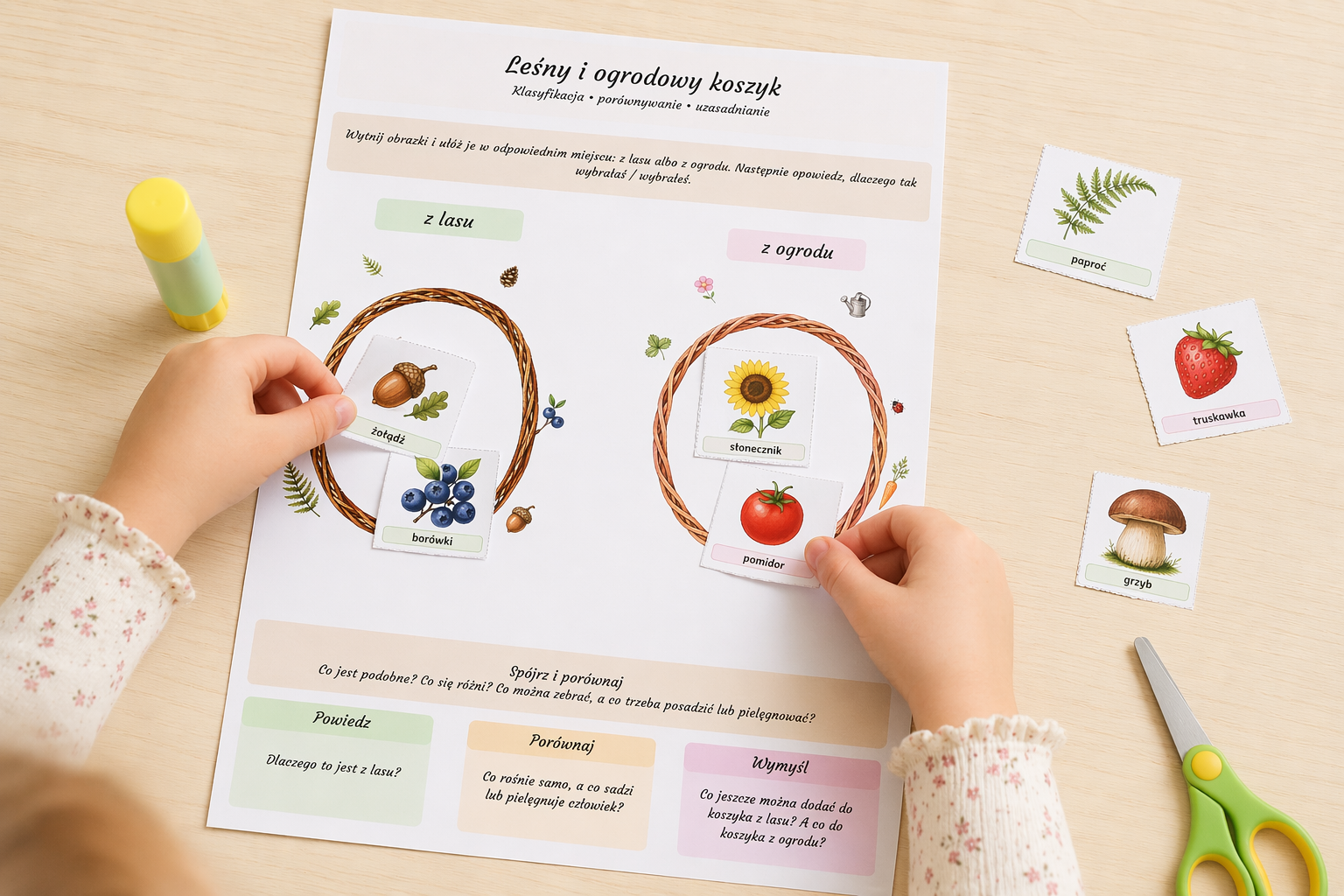 Uczniowie wycinają ilustracje i klasyfikują je do dwóch koszyków: z lasu 🌲 oraz z ogrodu 🌷. To jednak dopiero początek! Zadanie angażuje nie tylko ręce, ale przede wszystkim głowę – dzieci porównują, uzasadniają i wyciągają wnioski.