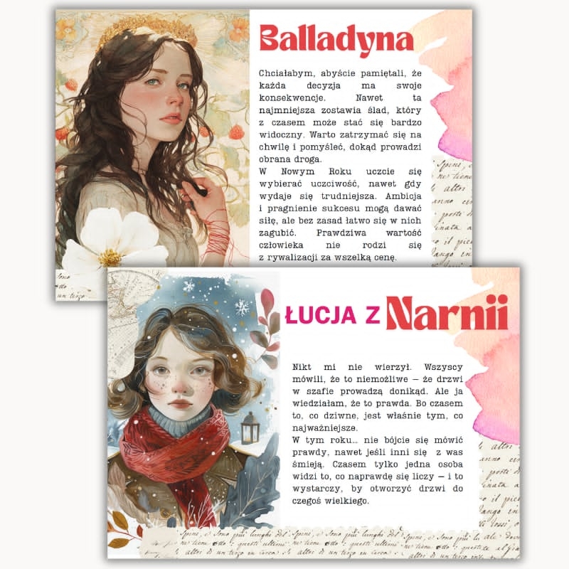 Zestaw „Listy na Nowy Rok od bohaterów lektur” to estetyczne, artystycznie zaprojektowane karty PDF, które łączą literaturę z nowoczesnym wychowaniem do wartości. Każda karta prezentuje list od bohatera lektury – napisany w pierwszej osobie, poruszający ważne tematy emocjonalne i wychowawcze – oraz puste karty przeznaczone do samodzielnej pracy uczniów. Gotowe karty inspirują do refleksji, rozmowy i autorefleksji, a puste karty pozwalają uczniom zapisać własne myśli, odpowiedzi, postanowienia i wnioski. Dzięki temu materiał nie jest jedynie do czytania, ale staje się narzędziem aktywnej pracy i dialogu.