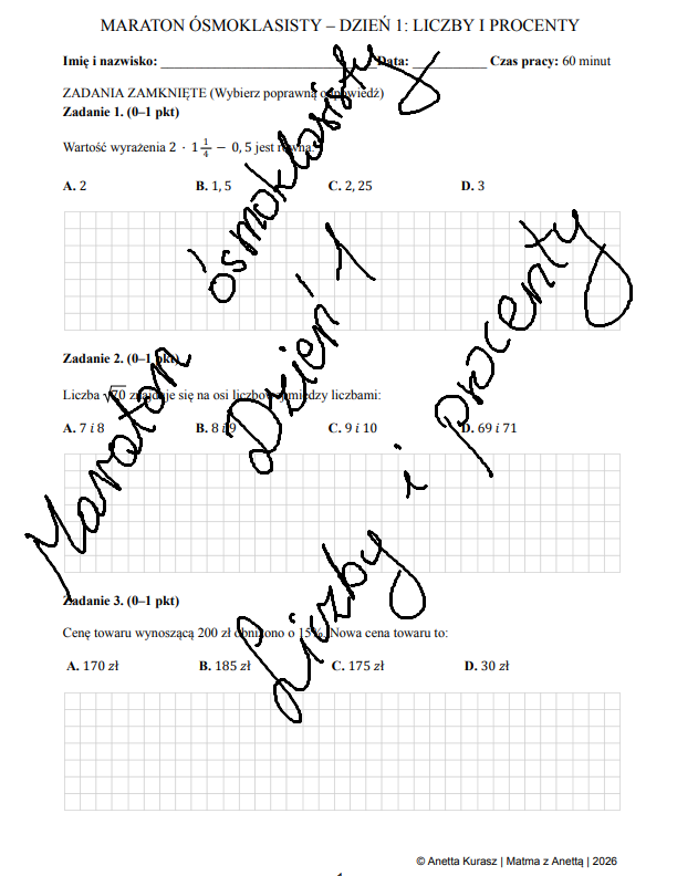 Arkusz zawiera 8 zadań sprawdzających praktyczne umiejętności matematyczne: