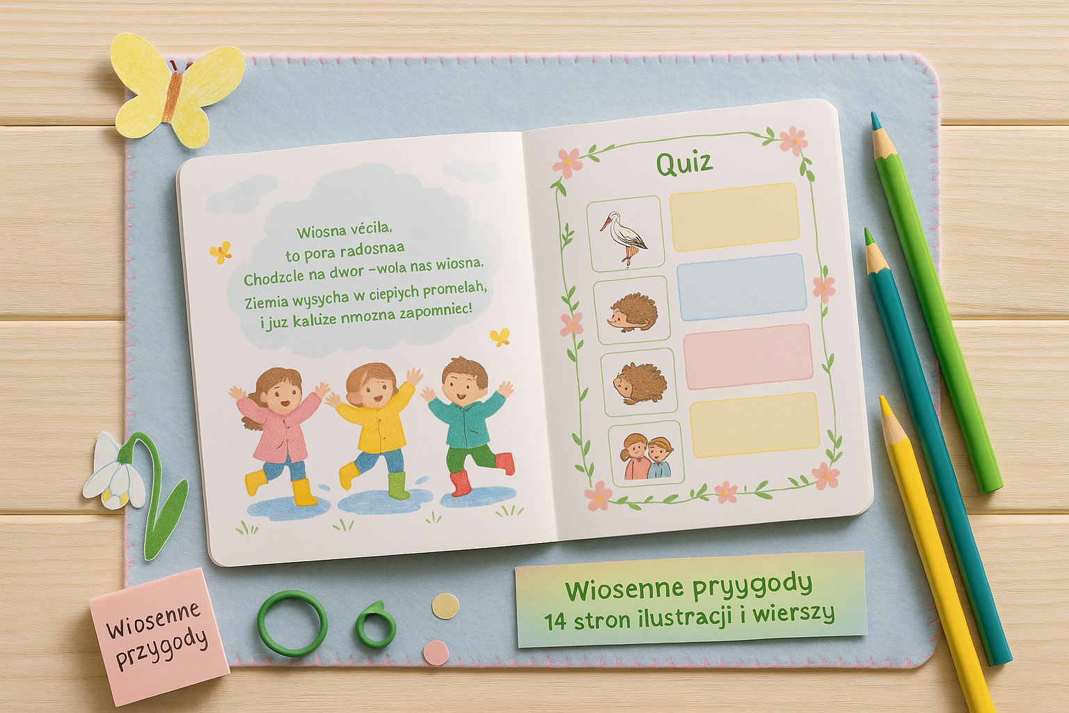 14 bogato ilustrowanych stron – każda strona to kolorowa przygoda: przebudzenie wiosny, zwierzątka, kwiaty, tęcza, sadzenie drzew i wiosenny odpoczynek!