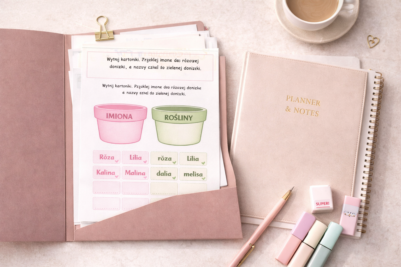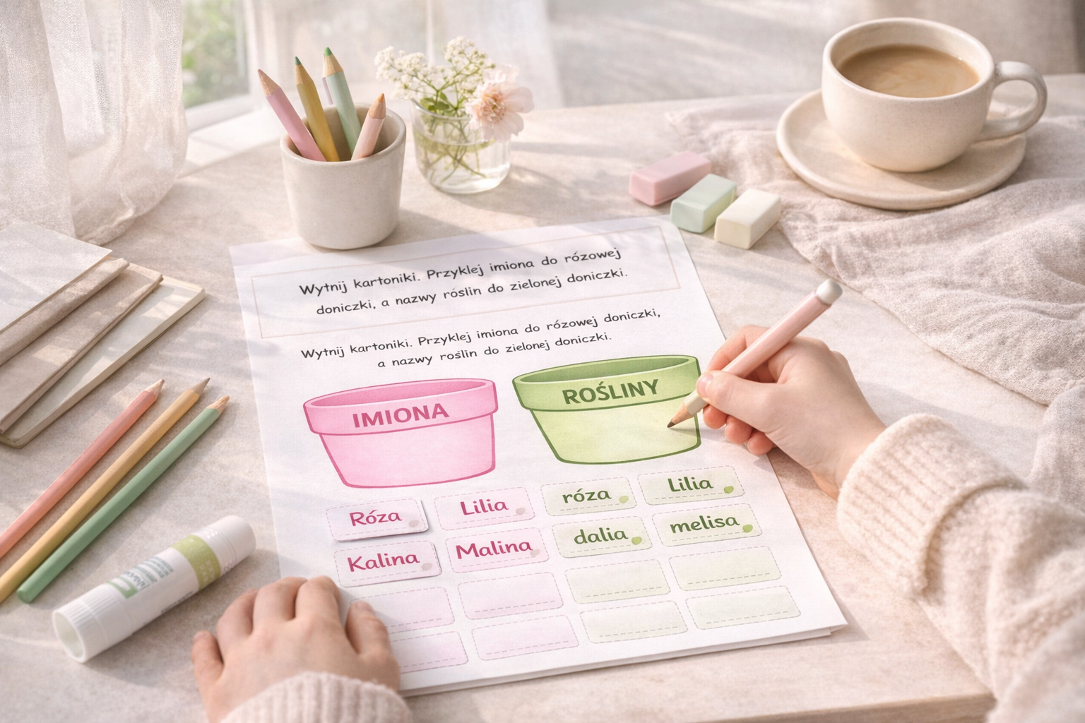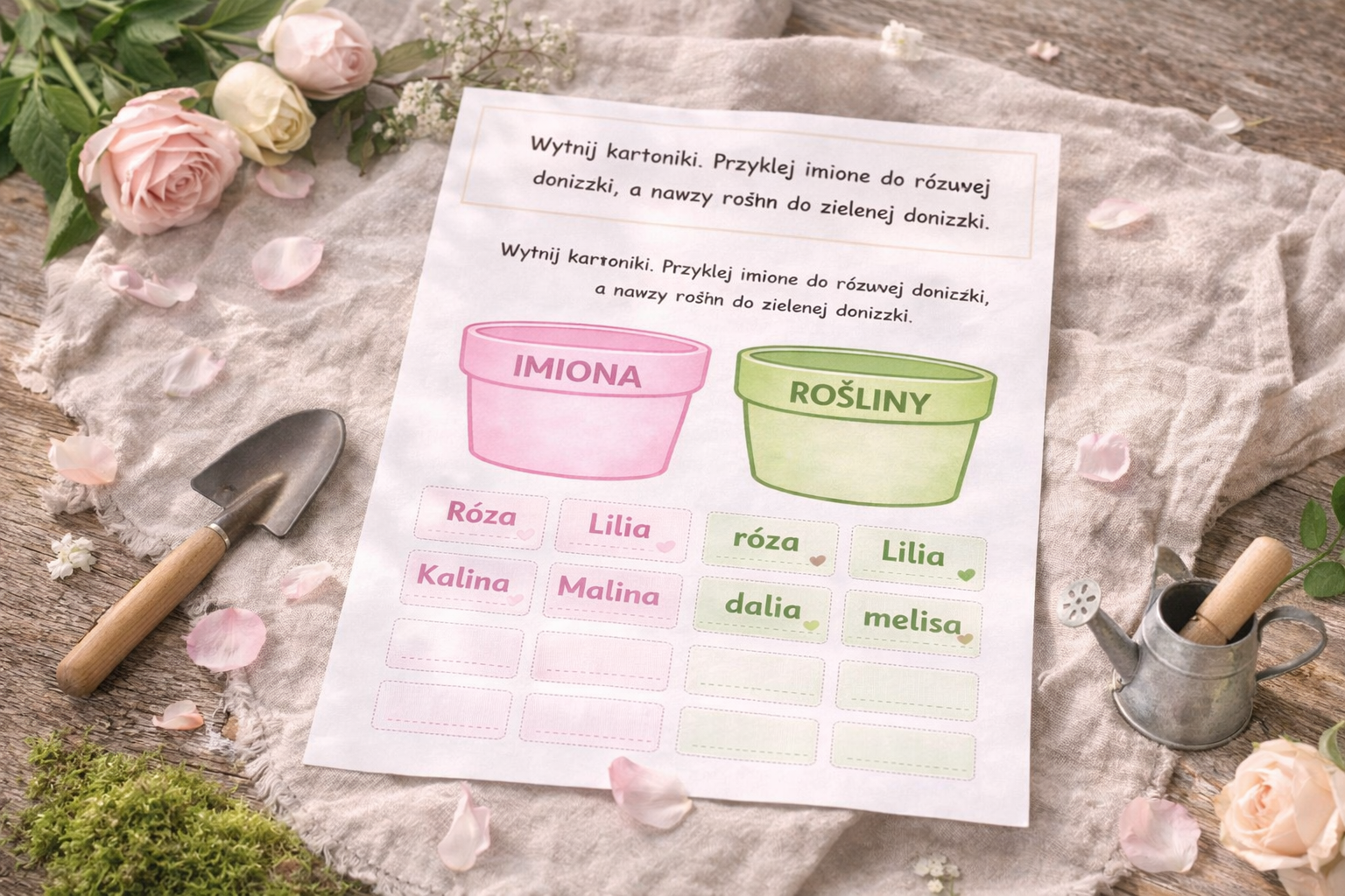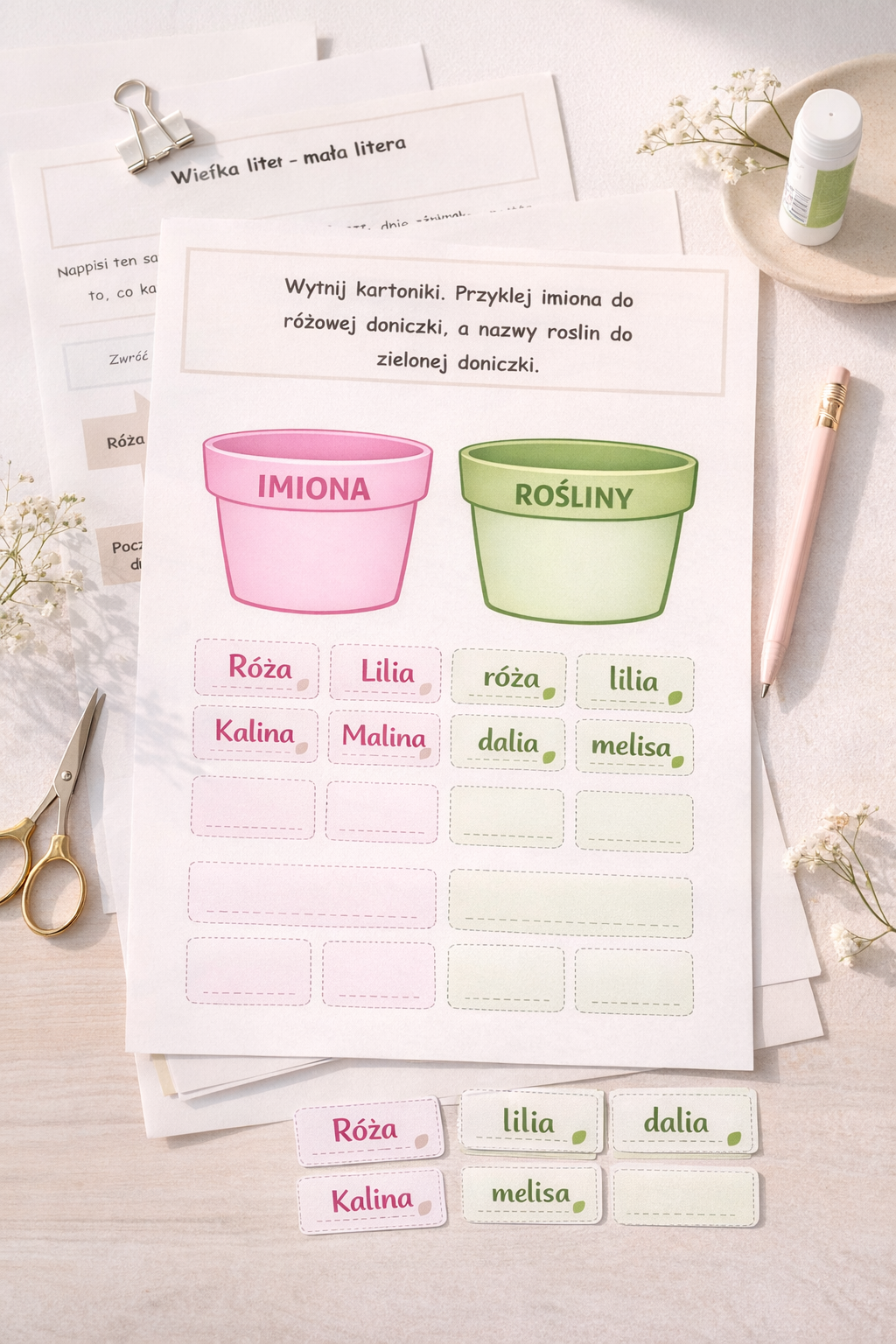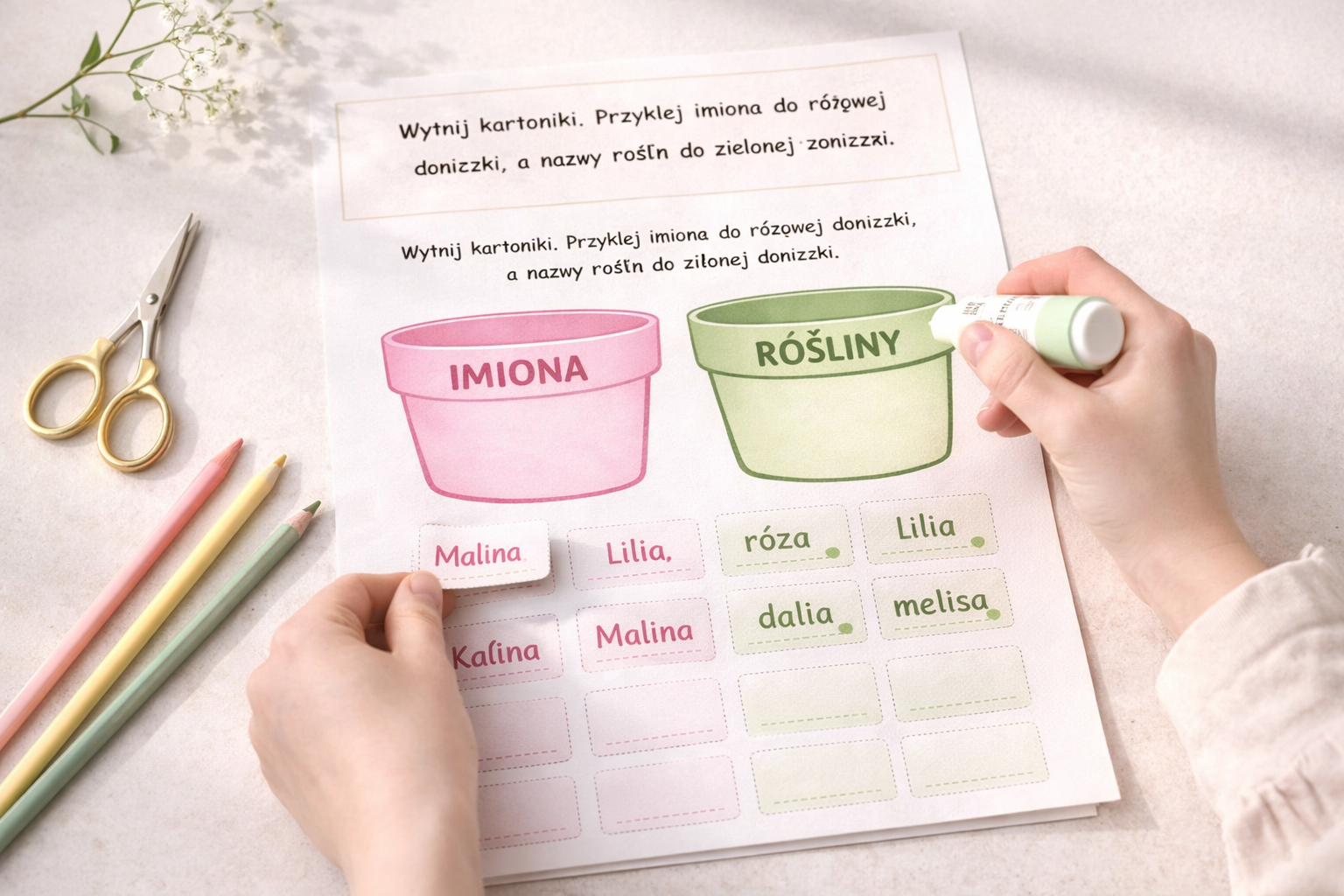 W zestawie znajduje się także aktywność typu wytnij i przyklej, w której należy dopasować wyrazy do dwóch doniczek: „IMIONA” i „ROŚLINY”. To świetne połączenie nauki języka z działaniem manualnym. Dzieci nie tylko patrzą i czytają, ale też fizycznie porządkują materiał, co wzmacnia zapamiętywanie i sprawia, że nauka jest bardziej angażująca.