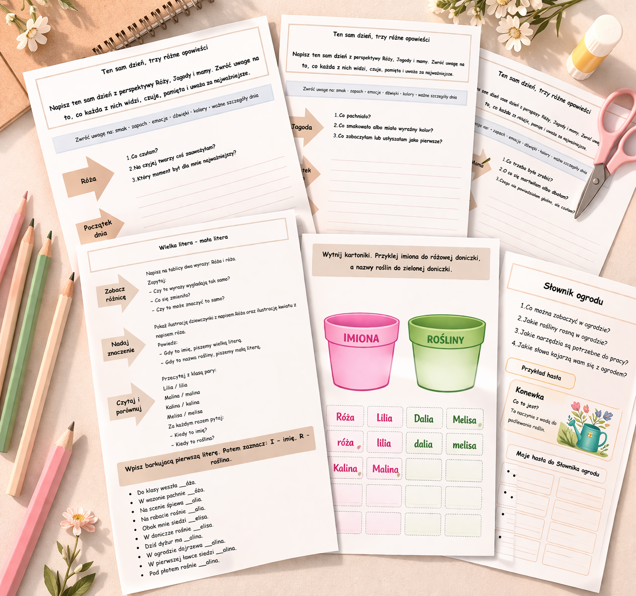 To świetna propozycja dla osób, które chcą łączyć naukę z ciekawą formą pracy. Materiał sprawdzi się zarówno podczas zajęć w klasie, jak i w domu, na zajęciach dodatkowych, wyrównawczych czy podczas spokojnej, twórczej pracy indywidualnej. Można wykorzystać go jako gotowy zestaw na lekcję, uzupełnienie tematu o ogrodzie, ćwiczenie ortograficzne albo inspirację do rozmowy o tym, że każdy może widzieć i przeżywać ten sam dzień inaczej 💛