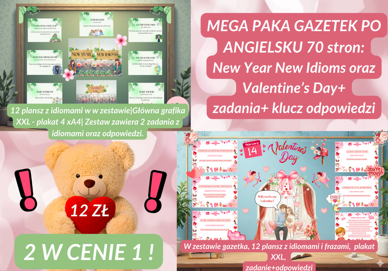 MEGAPAKA GAZETEK PO ANGIELSKU " NEW YEAR NEW IDIOMS" ORAZ VALENTINE'S DAY + PLAKATY XXL, KARTY PRACY Z KLUCZEM ODPOWIEDZI, KOLOROWE GRAFIKI