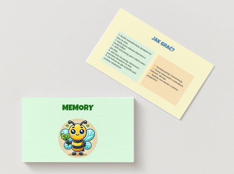 - Jeśli karty pasują – gracz zabiera parę i gra dalej!