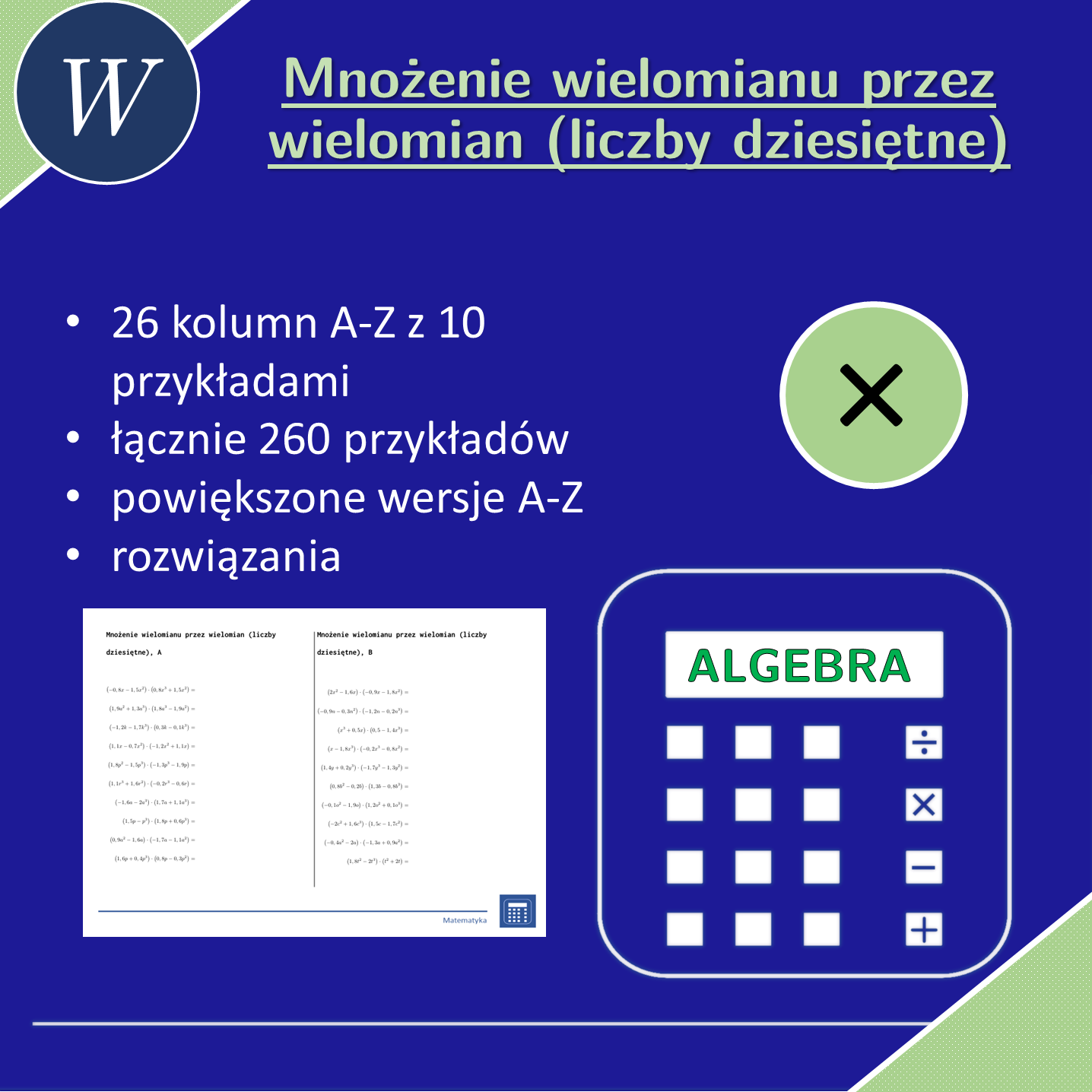 Co zawiera materiał: Materiał zawiera łącznie 26 kolumn (A-Z) po 10 przykładów każda (łącznie 260 przykładów) dotyczących mnożenie wielomianu przez wielomian (liczby dziesiętne) oraz rozwiązania tych kolumn. Dodatkowo wszystkie 26 kolumn (A-Z) jest dostępnych z dostosowanym rozmiarem czcionki do 20 dla uczniów z wadami wzroku.