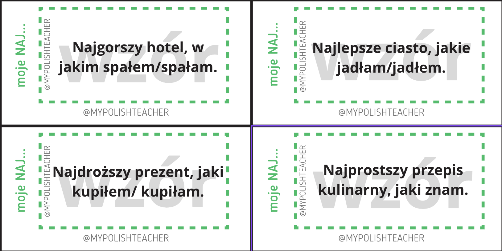 10 kart zawiera opisy, które uczniowie powinni rozwinąć, np. Najlepsza kawiarnia w moim mieście. Najgorsze jedzenie jakie jadłem/jadłam. Uczeń, który wylosował kartę opowiada o zadanym zagadnieniu, a pozostali mogą mu zadawać dodatkowe pytania.
