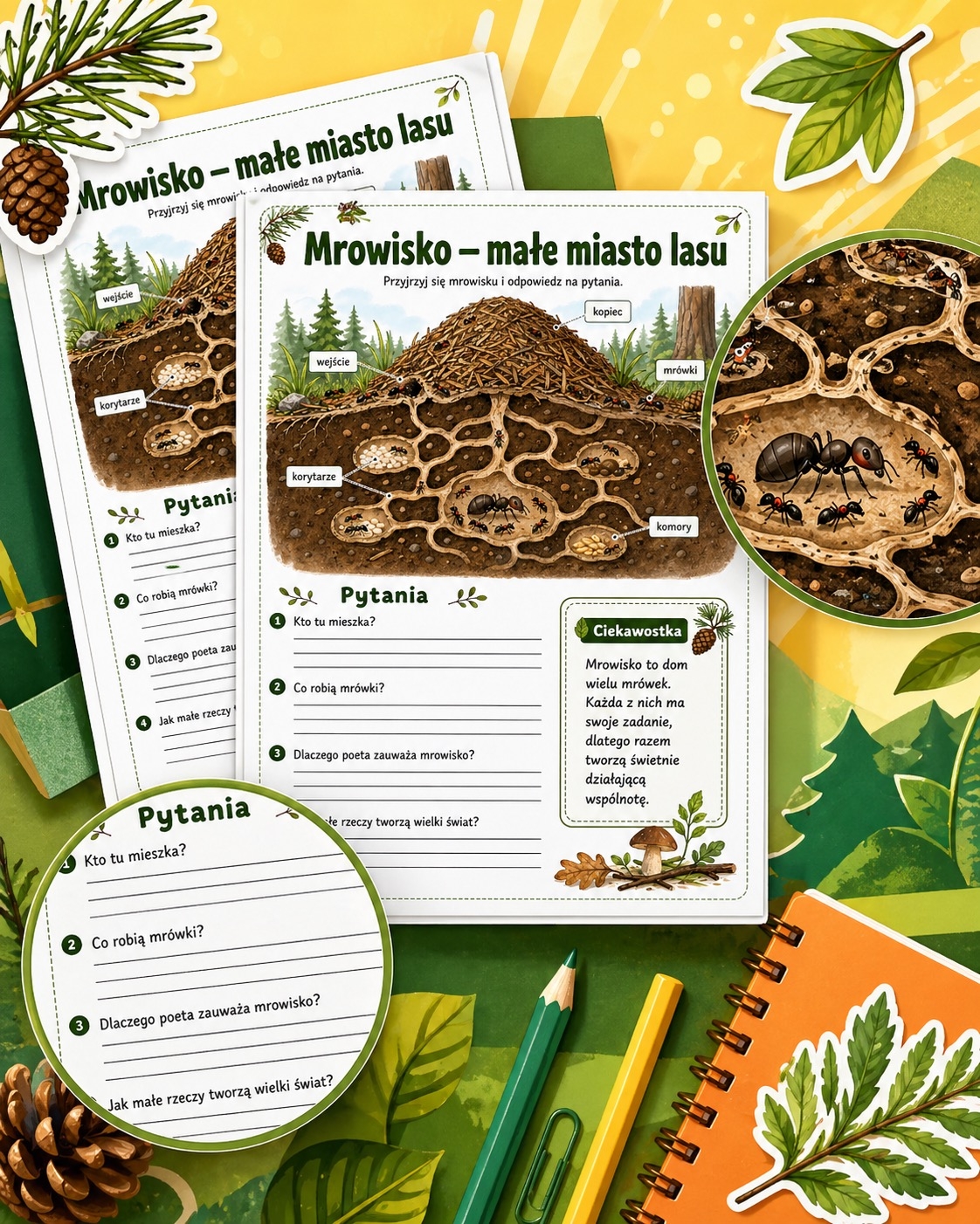 Karta świetnie sprawdzi się podczas zajęć o lesie, przyrodzie, świecie zwierząt, pracy zespołowej oraz przy omawianiu tekstów poetyckich, w których pojawia się motyw natury. Uczniowie mogą opisywać, kto mieszka w mrowisku, co robią mrówki i dlaczego warto zauważać nawet najmniejsze elementy otaczającego nas świata. ✏️🍃