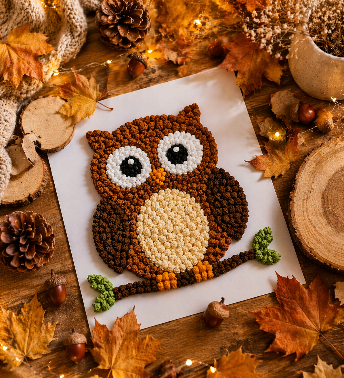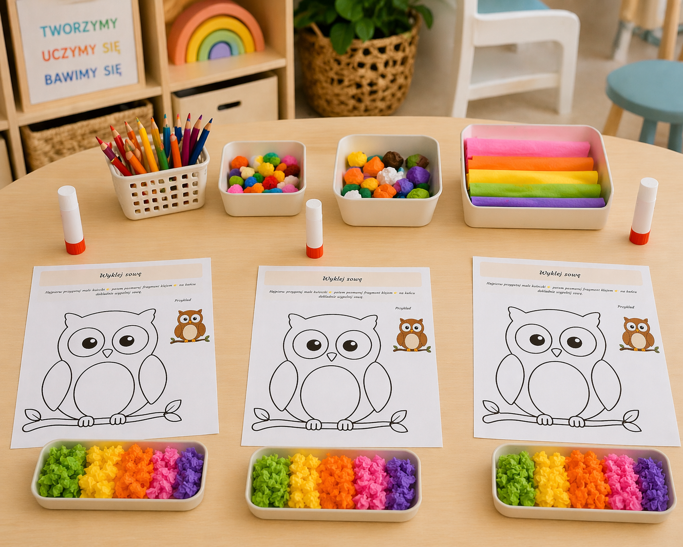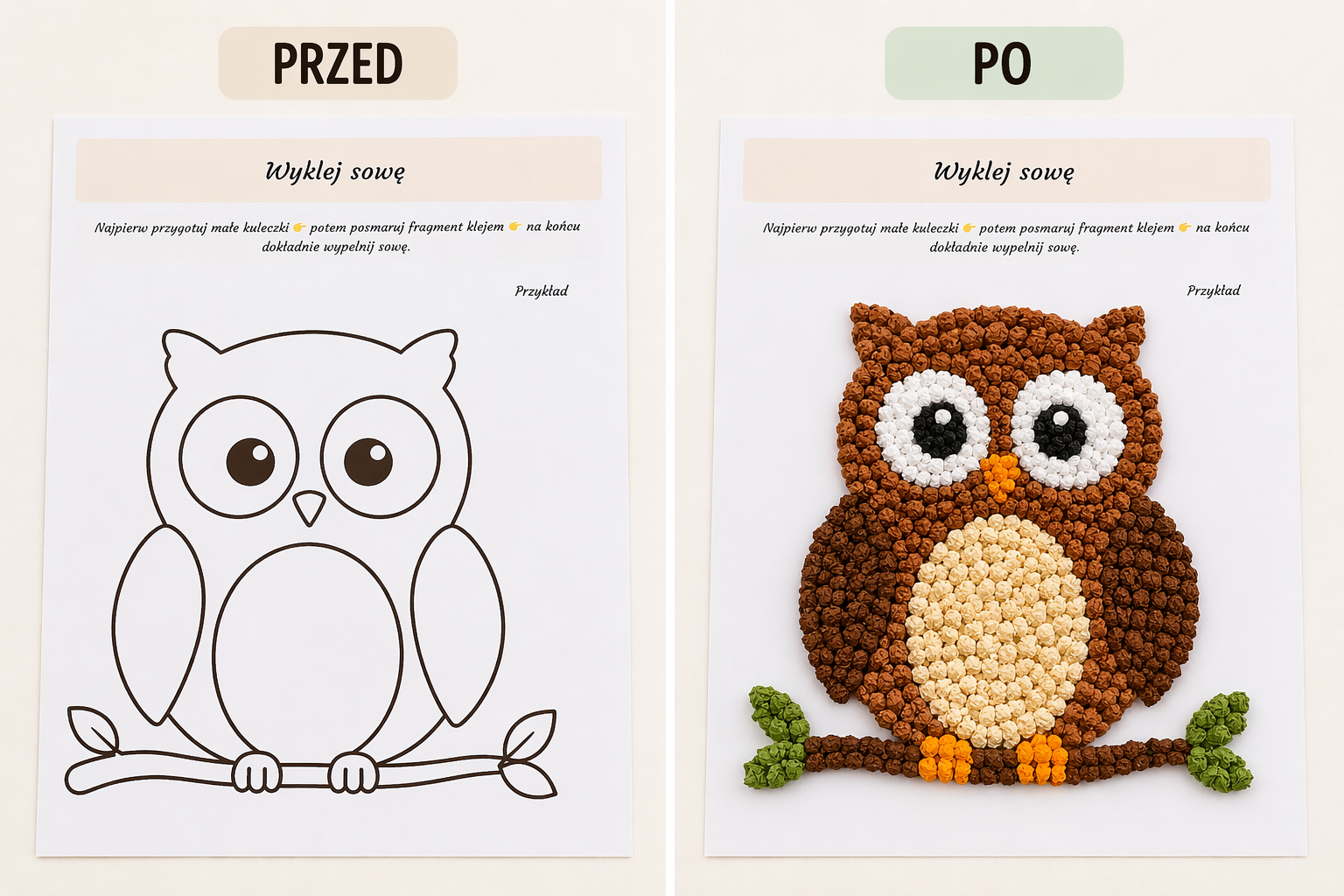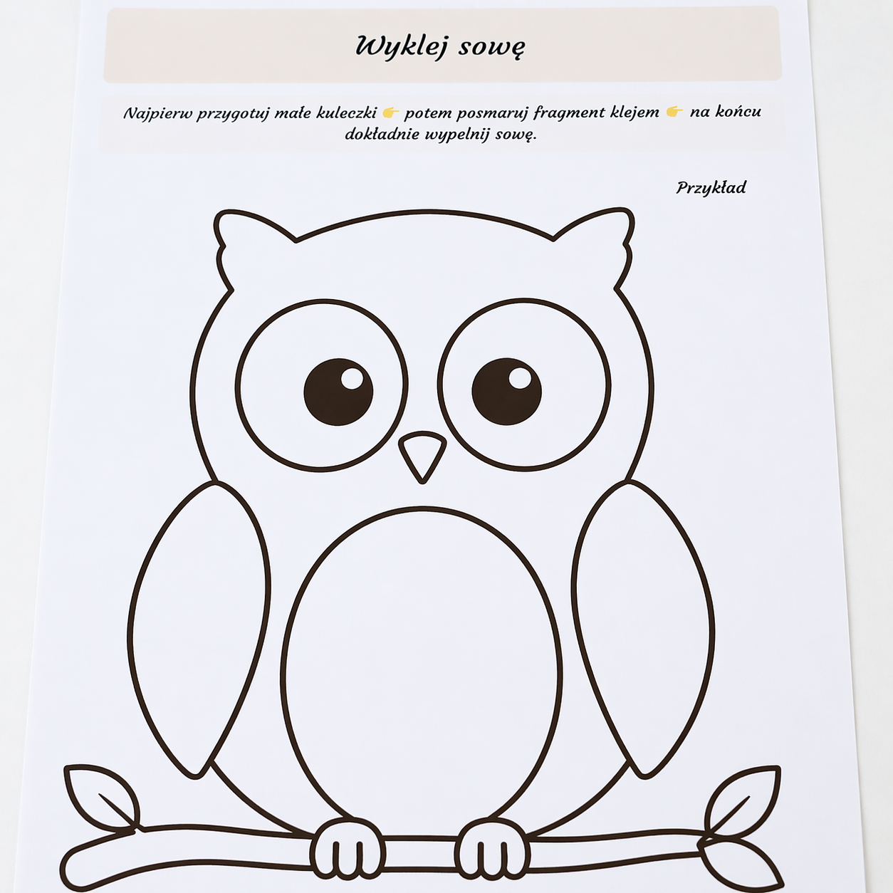 Wyklejanie sowy kulkami z bibuły lub plasteliny to świetny sposób na ćwiczenie małych rączek i rozwijanie koncentracji 💡